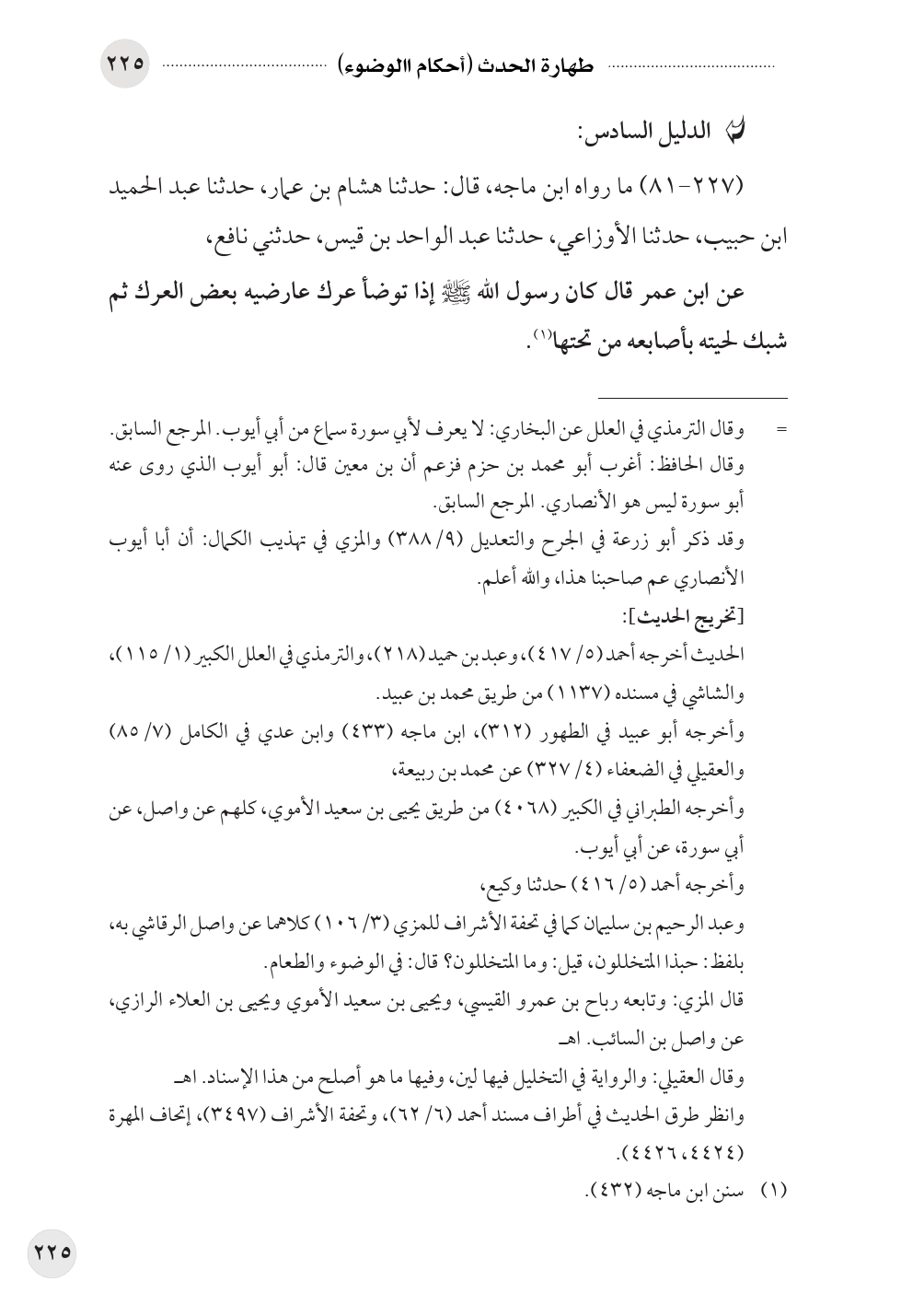 (٢٢٧ - ٨١) ما رواه ابن ماجه، قال: حدثنا هشام بن عمار، حدثنا عبد الحميد ابن حبيب، حدثنا الأوزاعي، حدثنا عبد الواحد بن قيس، حدثني نافع، عن ابن عمر قال كان رسول الله صلى الله عليه وسلم إذا توضأ عرك عارضيه بعض العرك ثم شبك لحيته بأصابعه من تحتها (¬١).