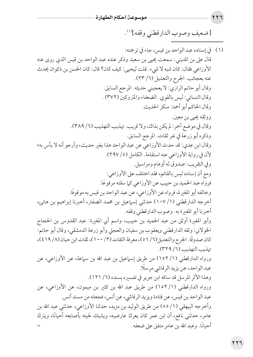 ورواه الدارقطني (١/ ١٥٢) من طريق إسماعيل بن عبد الله بن سماعة، عن الأوزاعي، عن عبد الواحد، عن يزيد الرقاشي مرسلًا.