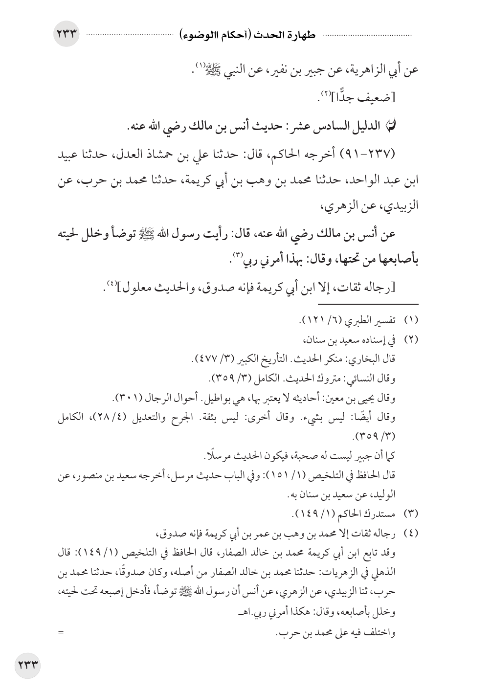 (¬٤) رجاله ثقات إلا محمد بن وهب بن عمر بن أبي كريمة فإنه صدوق، وقد تابع ابن أبي كريمة محمد بن خالد الصفار، قال الحافظ في التلخيص (١/ ١٤٩): قال الذهلي في الزهريات: حدثنا محمد بن خالد الصفار من أصله، وكان صدوقًا، حدثنا محمد بن حرب، ثنا الزبيدي، عن الزهري، عن أنس أن رسول الله صلى الله عليه وسلم توضأ، فأدخل إصبعه تحت لحيته، وخلل بأصابعه، وقال: هكذا أمرني ربي. اهـ