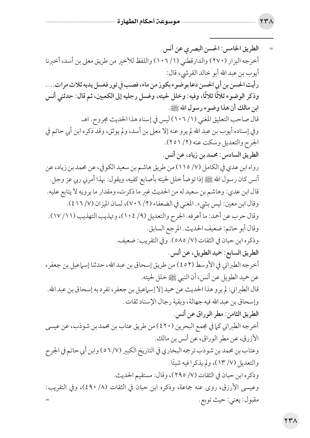 رأيت الحسن بن أبي الحسن دعا بوضوء بكوز من ماء، فصب في تور فغسل يديه ثلاث مرات .... وذكر الوضوء ثلاثًا ثلاثًا، وفيه: وخلل لحيته، وغسل رجليه إلى الكعبين، ثم قال: حدثني أنس ابن مالك أن هذا وضوء رسول الله صلى الله عليه وسلم.