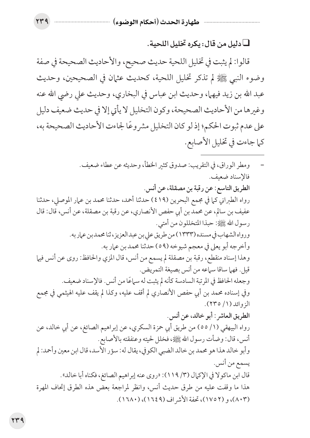 قالوا: لم يثبت في تخليل اللحية حديث صحيح، والأحاديث الصحيحة في صفة وضوء النبي صلى الله عليه وسلم لم تذكر تخليل اللحية، كحديث عثمان في الصحيحين، وحديث ... عبد الله بن زيد فيهما، وحديث ابن عباس في البخاري، وحديث علي رضي الله عنه وغيرها من الأحاديث الصحيحة، وكون التخليل لا يأتي إلا في حديث ضعيف دليل على عدم ثبوت الحكم؛ إذ لو كان التخليل مشروعًا لجاءت الأحاديث الصحيحة به، كما جاءت في تخليل الأصابع.