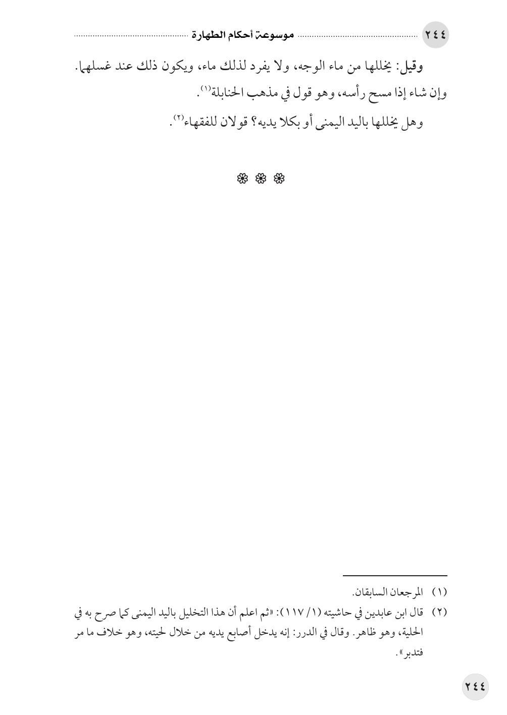 (¬٢) قال ابن عابدين في حاشيته (١/ ١١٧): «ثم اعلم أن هذا التخليل باليد اليمنى كما صرح به في الحلية، وهو ظاهر. وقال في الدرر: إنه يدخل أصابع يديه من خلال لحيته، وهو خلاف ما مر فتدبر».