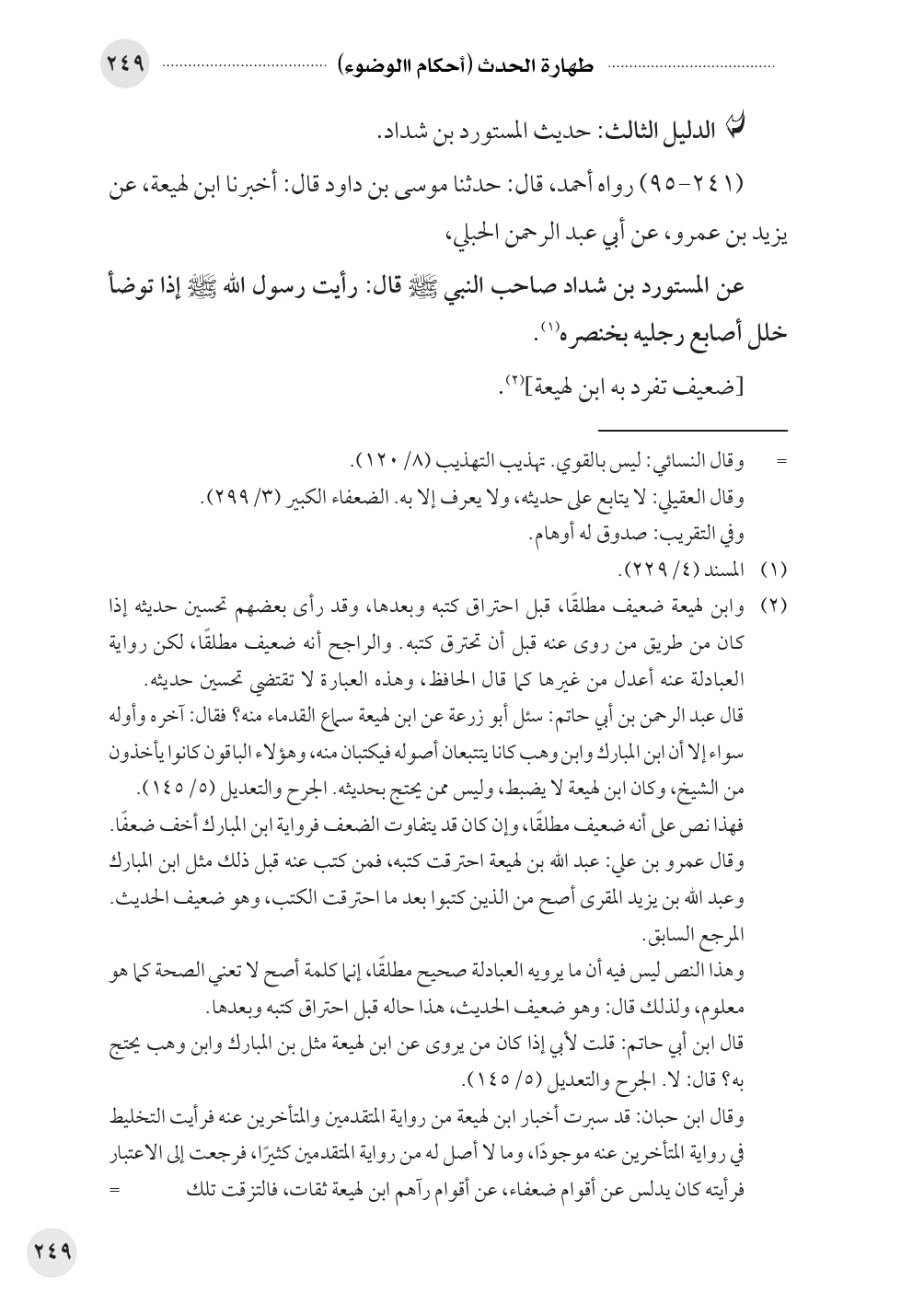 (¬٢) وابن لهيعة ضعيف مطلقًا، قبل احتراق كتبه وبعدها، وقد رأى بعضهم تحسين حديثه إذا كان من طريق من روى عنه قبل أن تحترق كتبه. والراجح أنه ضعيف مطلقًا، لكن رواية العبادلة عنه أعدل من غيرها كما قال الحافظ، وهذه العبارة لا تقتضي تحسين حديثه.