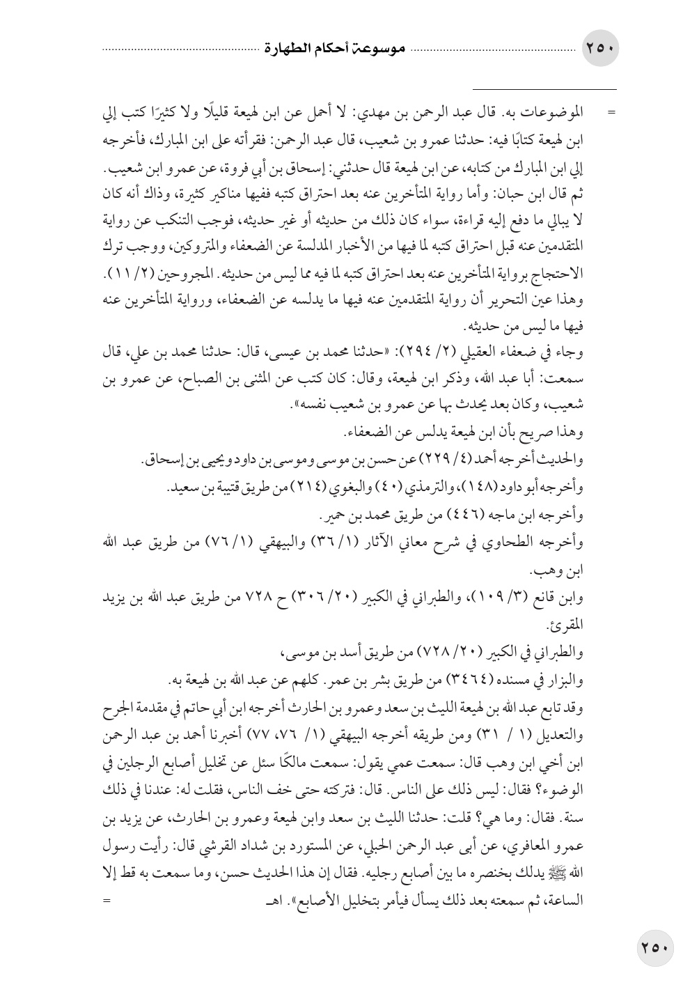 وقد تابع عبد الله بن لهيعة الليث بن سعد وعمرو بن الحارث أخرجه ابن أبي حاتم في مقدمة الجرح والتعديل (١/ ٣١) ومن طريقه أخرجه البيهقي (١/ ٧٦، ٧٧) أخبرنا أحمد بن عبد الرحمن ابن أخي ابن وهب قال: سمعت عمي يقول: سمعت مالكًا سئل عن تخليل أصابع الرجلين في الوضوء؟ فقال: ليس ذلك على الناس. قال: فتركته حتى خف الناس، فقلت له: عندنا في ذلك سنة. فقال: وما هي؟ قلت: حدثنا الليث بن سعد وابن لهيعة وعمرو بن الحارث، عن يزيد بن عمرو المعافري، عن أبى عبد الرحمن الحبلي، عن المستورد بن شداد القرشي قال: رأيت رسول الله صلى الله عليه وسلم يدلك بخنصره ما بين أصابع رجليه. فقال إن هذا الحديث حسن، وما سمعت به قط إلا الساعة، ثم سمعته بعد ذلك يسأل فيأمر بتخليل الأصابع». اهـ