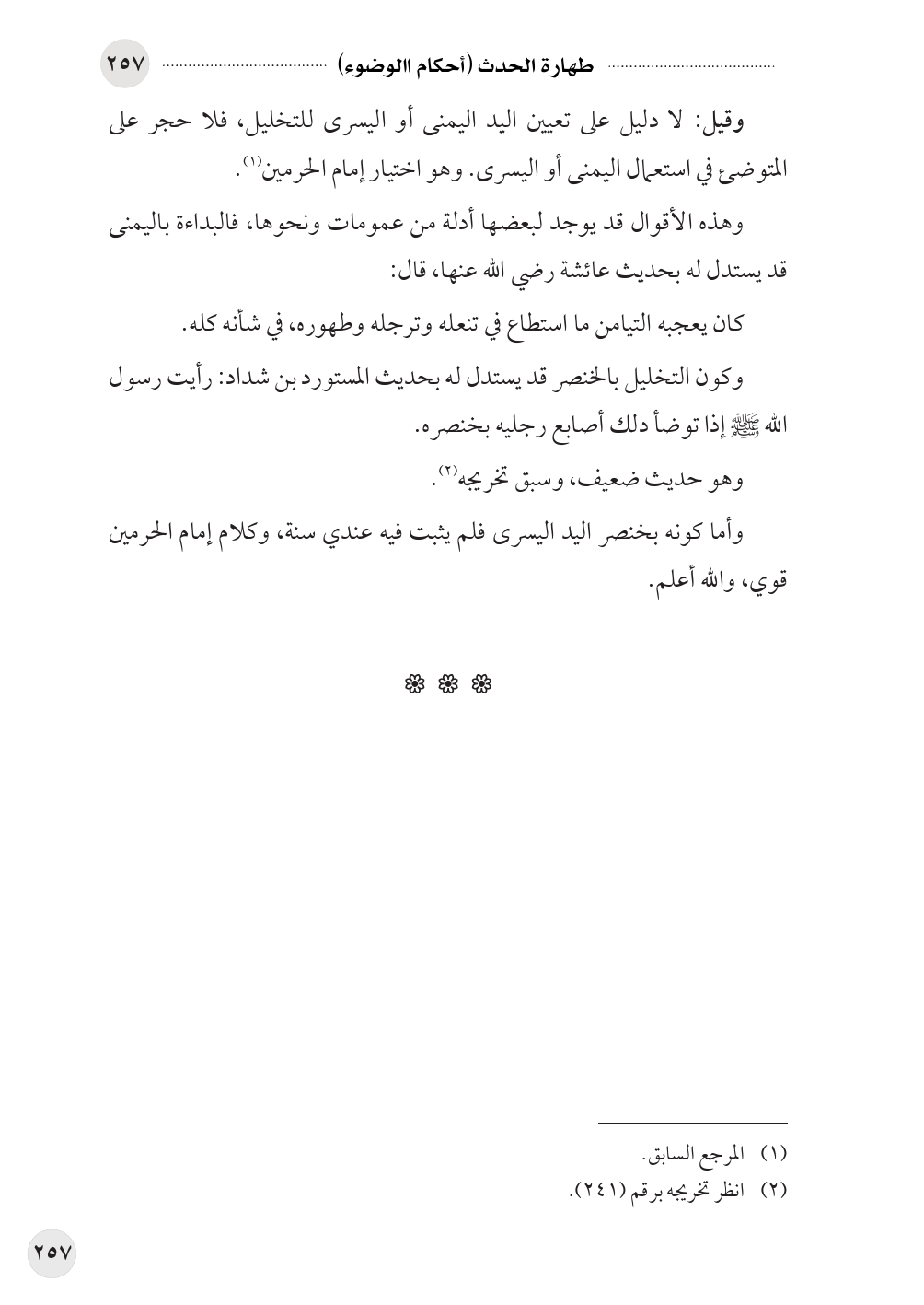 وقيل: لا دليل على تعيين اليد اليمنى أو اليسرى للتخليل، فلا حجر على المتوضئ في استعمال اليمنى أو اليسرى. وهو اختيار إمام الحرمين (¬١).