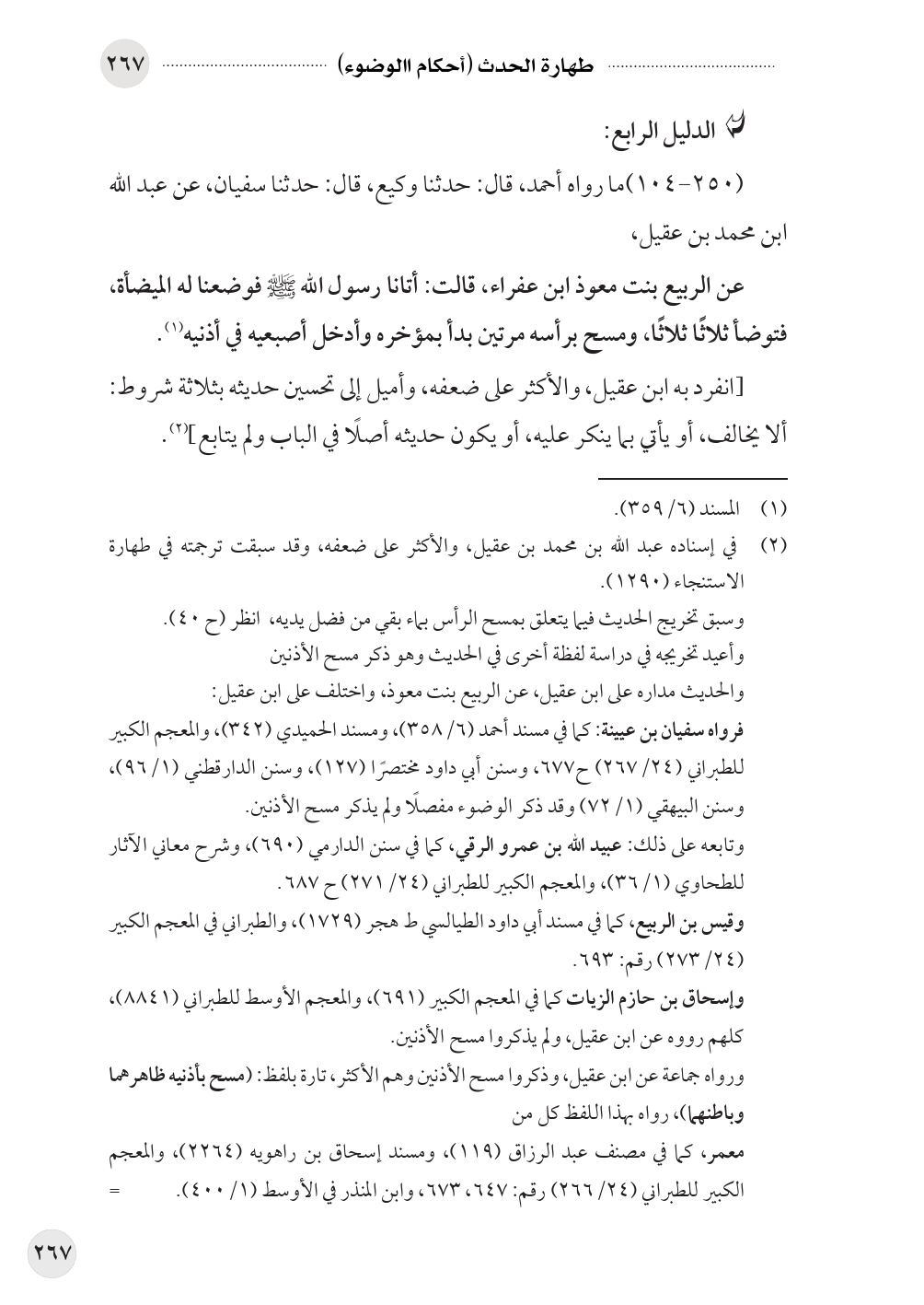 وأعيد تخريجه في دراسة لفظة أخرى في الحديث وهو ذكر مسح الأذنين، والحديث مداره على ابن عقيل، عن الربيع بنت معوذ، واختلف على ابن عقيل: