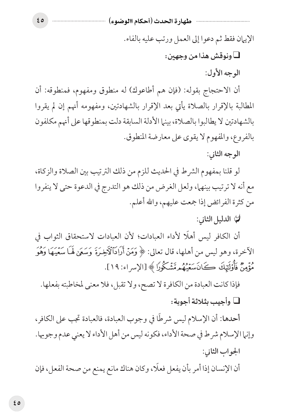 أن الاحتجاج بقوله: (فإن هم أطاعوك) له منطوق ومفهوم، فمنطوقه: أن المطالبة بالإقرار بالصلاة يأتي بعد الإقرار بالشهادتين، ومفهومه أنهم إن لم يقروا بالشهادتين لا يطالبوا بالصلاة، بينما الأدلة السابقة دلت بمنطوقها على أنهم مكلفون بالفروع، والمفهوم لا يقوى على معارضة المنطوق.