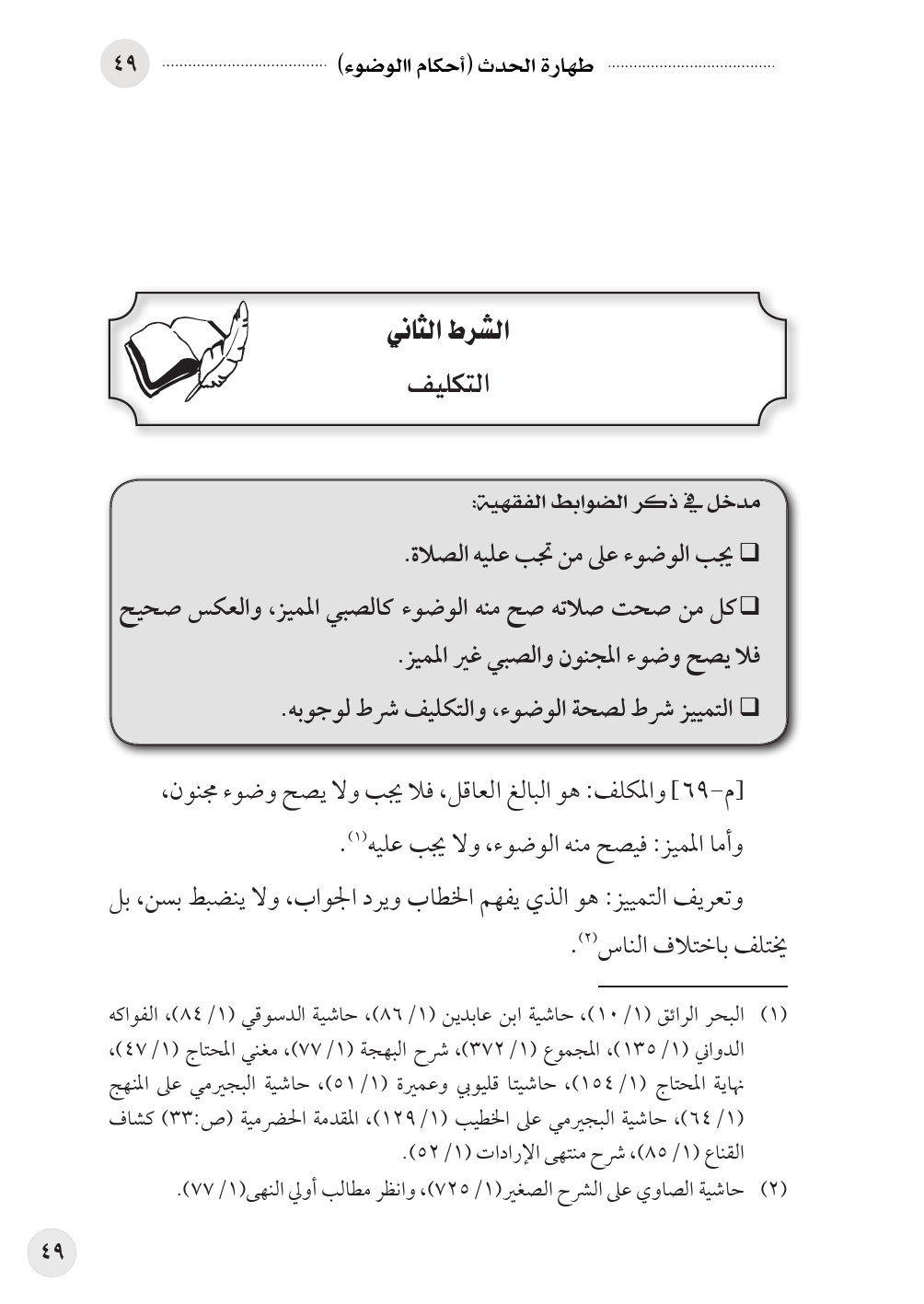 (¬١) البحر الرائق (١/ ١٠)، حاشية ابن عابدين (١/ ٨٦)، حاشية الدسوقي (١/ ٨٤)، الفواكه الدواني (١/ ١٣٥)، المجموع (١/ ٣٧٢)، شرح البهجة (١/ ٧٧)، مغني المحتاج (١/ ٤٧)، نهاية المحتاج (١/ ١٥٤)، حاشيتا قليوبي وعميرة (١/ ٥١)، حاشية البجيرمي على المنهج (١/ ٦٤)، حاشية البجيرمي على الخطيب (١/ ١٢٩)، المقدمة الحضرمية (ص: ٣٣) كشاف القناع (١/ ٨٥)، شرح منتهى الإرادات (١/ ٥٢).