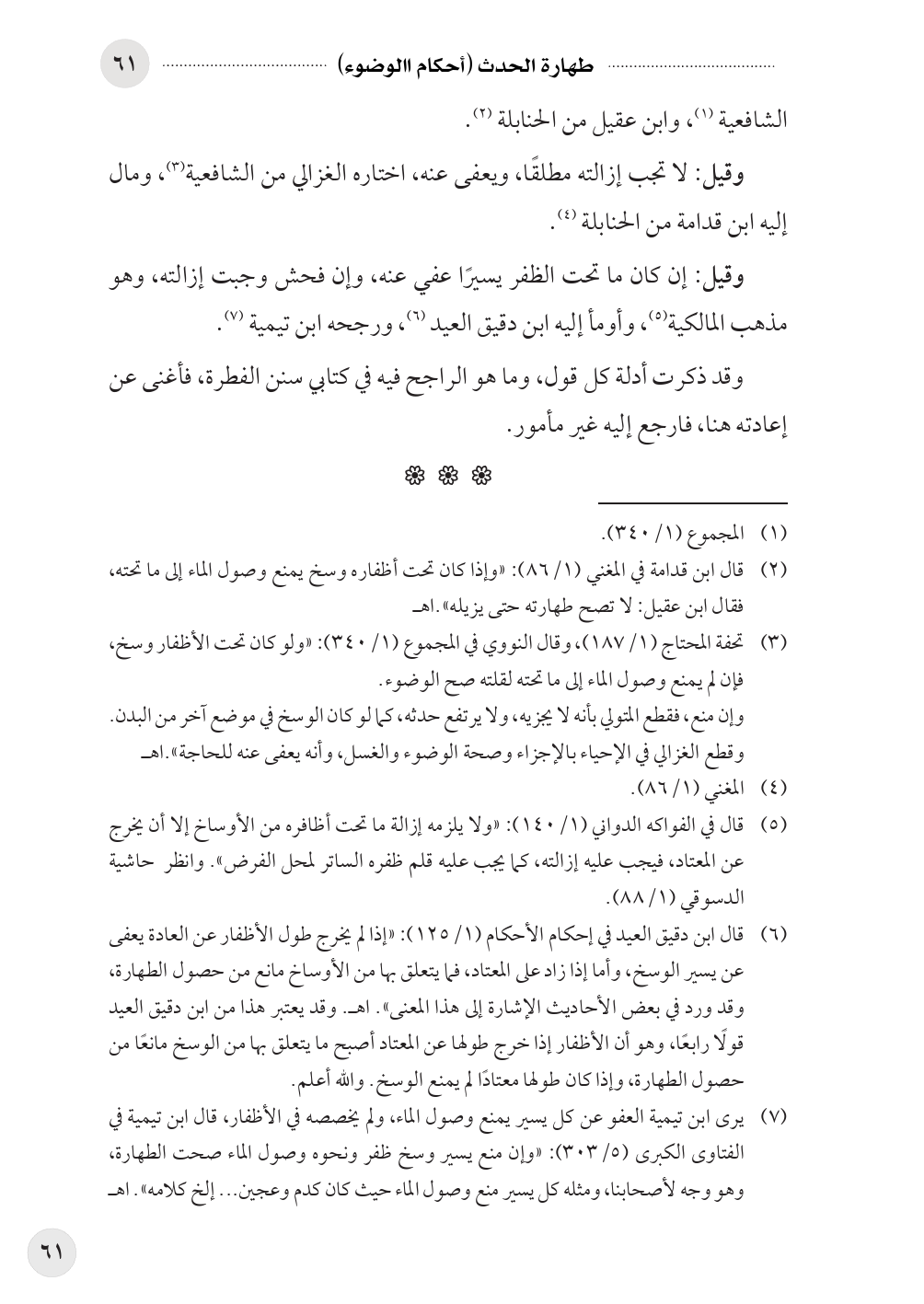 (¬٦) قال ابن دقيق العيد في إحكام الأحكام (١/ ١٢٥): «إذا لم يخرج طول الأظفار عن العادة يعفى عن يسير الوسخ، وأما إذا زاد على المعتاد، فما يتعلق بها من الأوساخ مانع من حصول الطهارة، وقد ورد في بعض الأحاديث الإشارة إلى هذا المعنى». اهـ. وقد يعتبر هذا من ابن دقيق العيد قولًا رابعًا، وهو أن الأظفار إذا خرج طولها عن المعتاد أصبح ما يتعلق بها من الوسخ مانعًا من حصول الطهارة، وإذا كان طولها معتادًا لم يمنع الوسخ. والله أعلم.