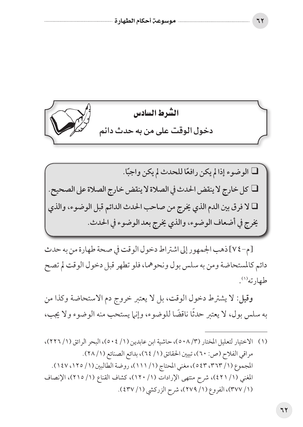 (¬١) الاختيار لتعليل المختار (٣/ ٥٠٨)، حاشية ابن عابدين (١/ ٥٠٤)، البحر الرائق (١/ ٢٢٦)، مراقي الفلاح (ص: ٦٠)، تبيين الحقائق (١/ ٦٤)، بدائع الصنائع (١/ ٢٨).