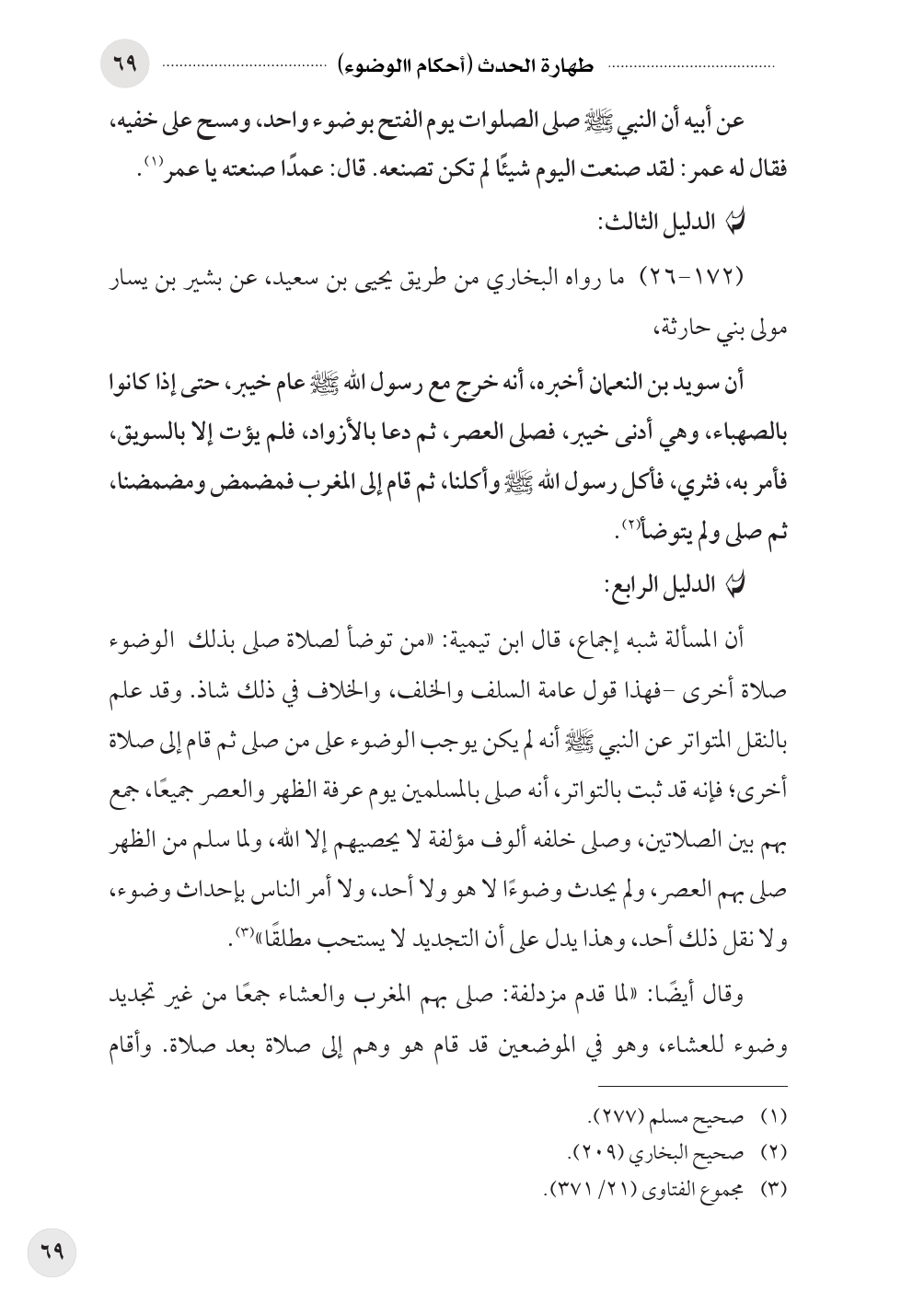 أن المسألة شبه إجماع، قال ابن تيمية: «من توضأ لصلاة صلى بذلك الوضوء صلاة أخرى -فهذا قول عامة السلف والخلف، والخلاف في ذلك شاذ. وقد علم بالنقل المتواتر عن النبي صلى الله عليه وسلم أنه لم يكن يوجب الوضوء على من صلى ثم قام إلى صلاة أخرى؛ فإنه قد ثبت بالتواتر، أنه صلى بالمسلمين يوم عرفة الظهر والعصر جميعًا، جمع بهم بين الصلاتين، وصلى خلفه ألوف مؤلفة لا يحصيهم إلا الله، ولما سلم من الظهر صلى بهم العصر، ولم يحدث وضوءًا لا هو ولا أحد، ولا أمر الناس بإحداث وضوء، ولا نقل ذلك أحد، وهذا يدل على أن التجديد لا يستحب مطلقًا» (¬٣).