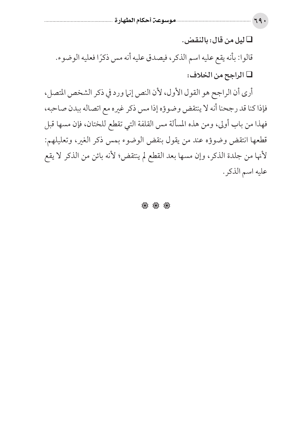 أرى أن الراجح هو القول الأول، لأن النص إنما ورد في ذكر الشخص المتصل، فإذا كنا قد رجحنا أنه لا ينتقض وضوؤه إذا مس ذكر غيره مع اتصاله ببدن صاحبه، فهذا من باب أولى، ومن هذه المسألة مس القلفة التي تقطع للختان، فإن مسها قبل قطعها انتقض وضوؤه عند من يقول بنقض الوضوء بمس ذكر الغير، وتعليلهم: لأنها من جلدة الذكر، وإن مسها بعد القطع لم ينتقض؛ لأنه بائن من الذكر لا يقع عليه اسم الذكر.