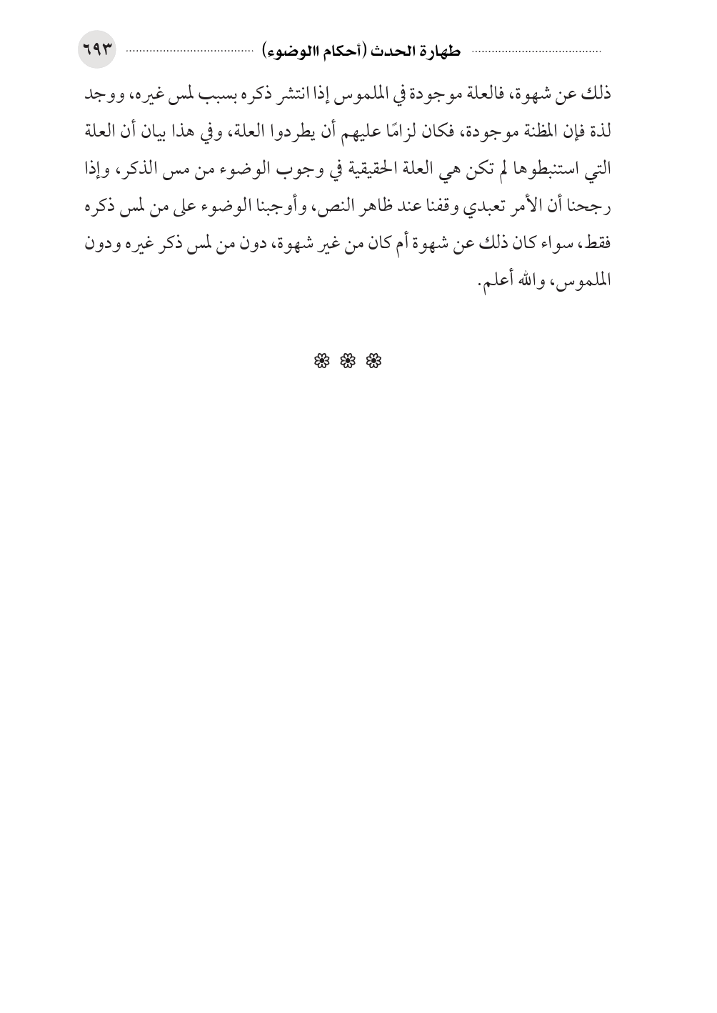 ذلك عن شهوة، فالعلة موجودة في الملموس إذا انتشر ذكره بسبب لمس غيره، ووجد لذة فإن المظنة موجودة، فكان لزامًا عليهم أن يطردوا العلة، وفي هذا بيان أن العلة التي استنبطوها لم تكن هي العلة الحقيقية في وجوب الوضوء من مس الذكر، وإذا رجحنا أن الأمر تعبدي وقفنا عند ظاهر النص، وأوجبنا الوضوء على من لمس ذكره فقط، سواء كان ذلك عن شهوة أم كان من غير شهوة، دون من لمس ذكر غيره ودون الملموس، والله أعلم.