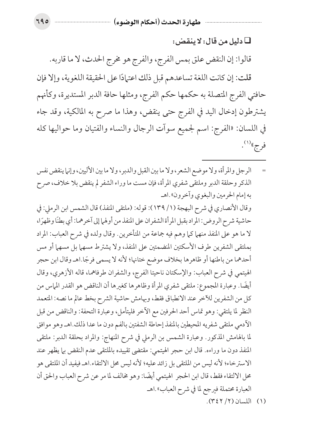 قلت: إن كانت اللغة تساعدهم قبل ذلك اعتمادًا على الحقيقة اللغوية، وإلا فإن حافتي الفرج المتصلة به حكمها حكم الفرج، ومثلها حافة الدبر المستديرة، وكأنهم يشترطون إدخال اليد في الفرج حتى ينقض، وهذا ما صرح به المالكية، وقد جاء في اللسان: «الفرج: اسم لجميع سوآت الرجال والنساء والفتيان وما حواليها كله فرج» (¬١).