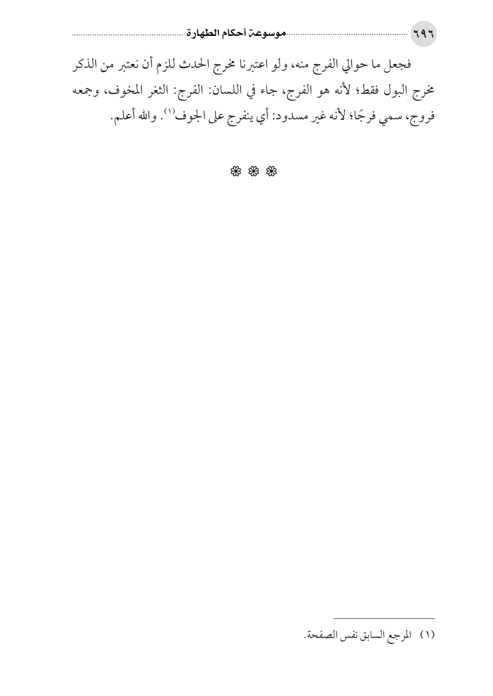 فجعل ما حوالي الفرج منه، ولو اعتبرنا مخرج الحدث للزم أن نعتبر من الذكر مخرج البول فقط؛ لأنه هو الفرج، جاء في اللسان: الفرج: الثغر المخوف، وجمعه فروج، سمي فرجًا؛ لأنه غير مسدود: أي ينفرج على الجوف (¬١). والله أعلم.