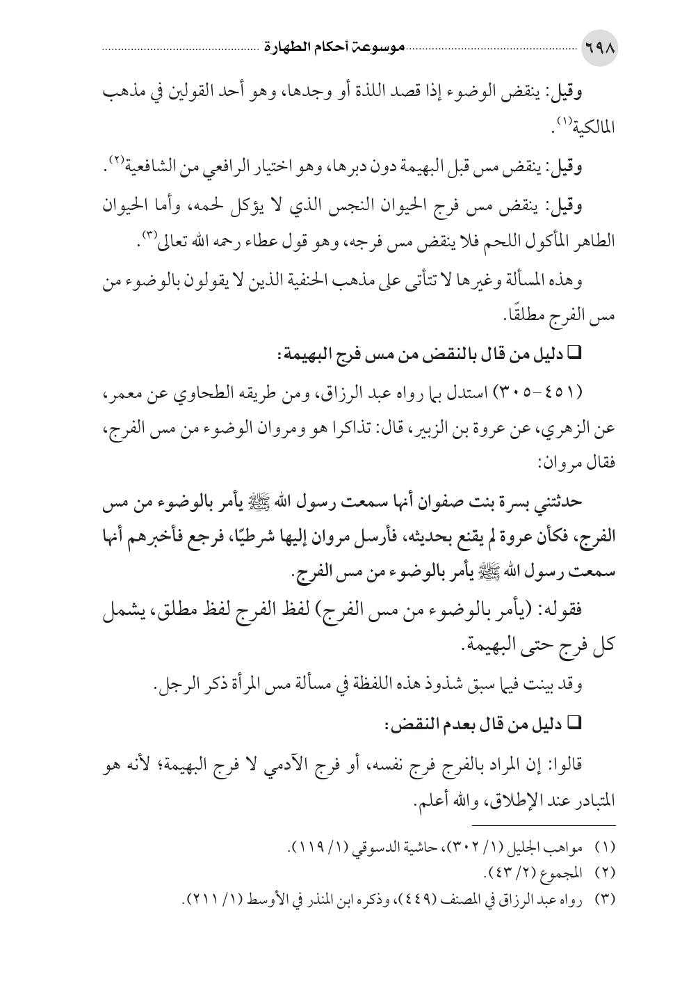 (٤٥١ - ٣٠٥) استدل بما رواه عبد الرزاق، ومن طريقه الطحاوي عن معمر، عن الزهري، عن عروة بن الزبير، قال: تذاكرا هو ومروان الوضوء من مس الفرج، فقال مروان: