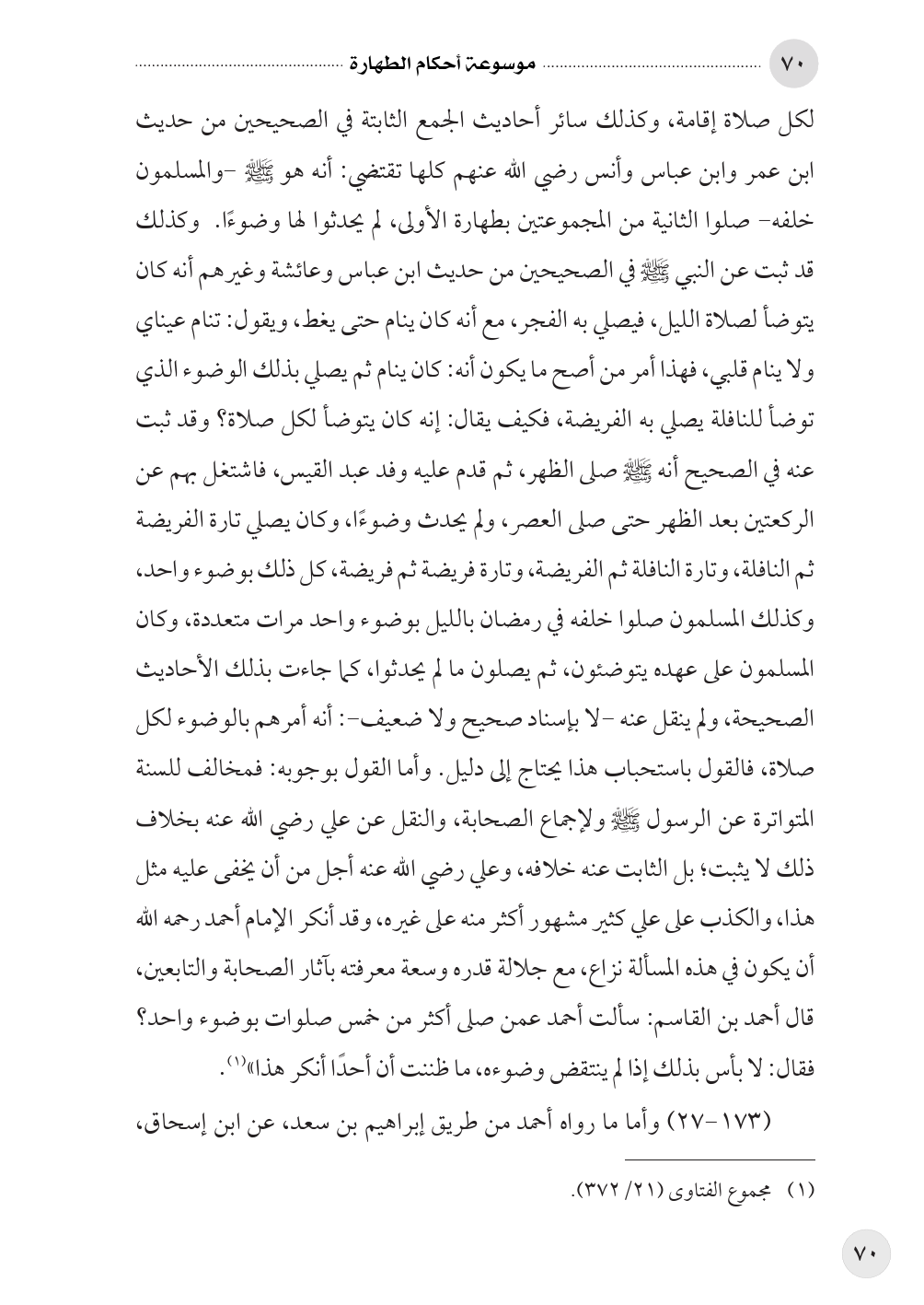 وأما القول بوجوبه: فمخالف للسنة المتواترة عن الرسول صلى الله عليه وسلم ولإجماع الصحابة، والنقل عن علي رضي الله عنه بخلاف ذلك لا يثبت؛ بل الثابت عنه خلافه، وعلي رضي الله عنه أجل من أن يخفى عليه مثل هذا، والكذب على علي كثير مشهور أكثر منه على غيره، وقد أنكر الإمام أحمد رحمه الله أن يكون في هذه المسألة نزاع، مع جلالة قدره وسعة معرفته بآثار الصحابة والتابعين، قال أحمد بن القاسم: سألت أحمد عمن صلى أكثر من خمس صلوات بوضوء واحد؟ فقال: لا بأس بذلك إذا لم ينتقض وضوءه، ما ظننت أن أحدًا أنكر هذا» (¬١). (١٧٣ - ٢٧) وأما ما رواه أحمد من طريق إبراهيم بن سعد، عن ابن إسحاق،