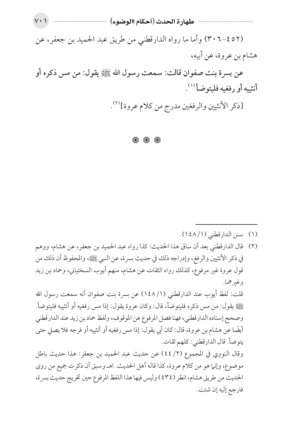 (¬٢) قال الدارقطني بعد أن ساق هذا الحديث: كذا رواه عبد الحميد بن جعفر، عن هشام، ووهم في ذكر الأنثيين والرفغ، وإدراجه ذلك في حديث بسرة، عن النبي صلى الله عليه وسلم، والمحفوظ أن ذلك من قول عروة غير مرفوع، كذلك رواه الثقات عن هشام، منهم أيوب السختياني، وحماد بن زيد وغيرهما.