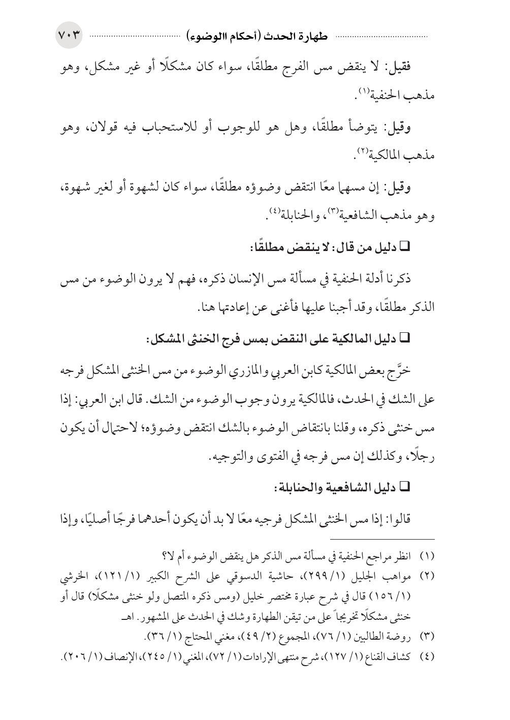 (¬٢) مواهب الجليل (١/ ٢٩٩)، حاشية الدسوقي على الشرح الكبير (١/ ١٢١)، الخرشي (١/ ١٥٦) قال في شرح عبارة مختصر خليل (ومس ذكره المتصل ولو خنثى مشكلًا) قال أو خنثى مشكلًا تخريجًا على من تيقن الطهارة وشك في الحدث على المشهور. اهـ