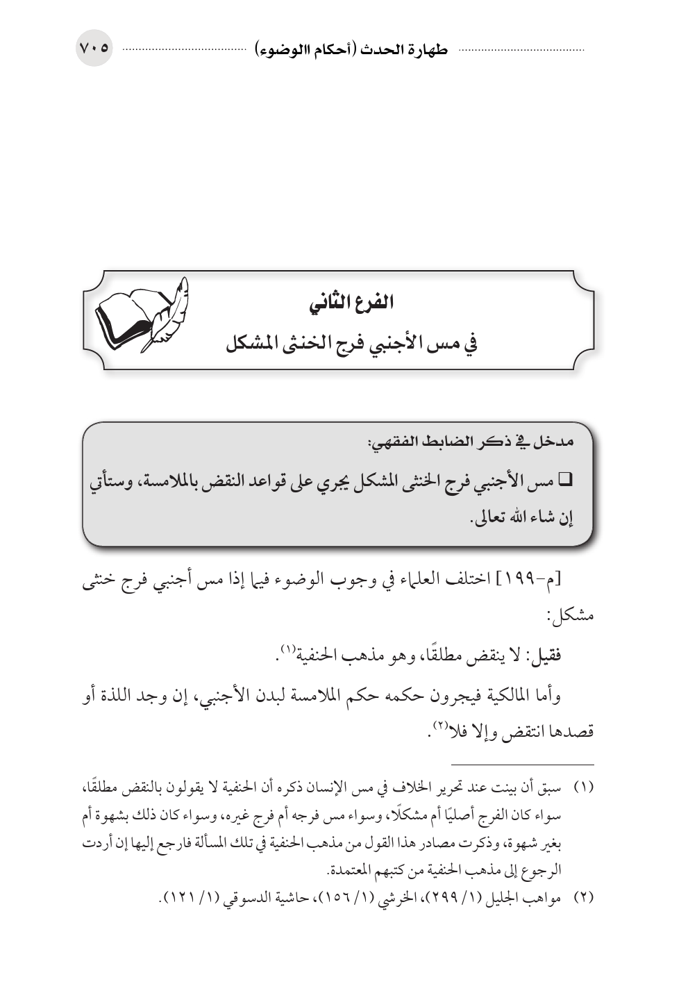 • مس الأجنبي فرج الخنثى المشكل يجري على قواعد النقض بالملامسة، وستأتي إن شاء الله تعالى.
