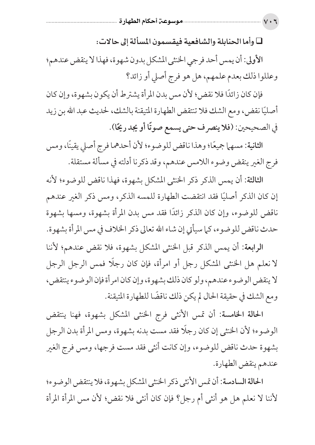 الحالة الخامسة: أن تمس الأنثى فرج الخنثى المشكل بشهوة، فهنا ينتقض الوضوء؛ لأن الخنثى إن كان رجلًا فقد مست بدنه بشهوة، ومس المرأة بدن الرجل بشهوة حدث ناقض للوضوء، وإن كانت أنثى فقد مست فرجها، ومس فرج الغير عندهم ينقض الطهارة.