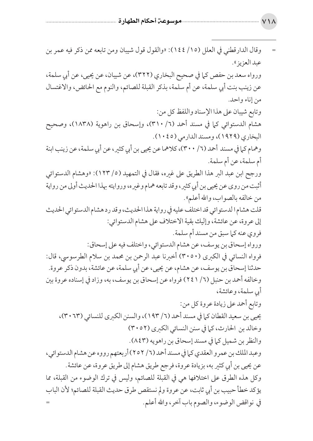 وكل هذه الطرق على اختلافها هي في القبلة للصائم، وليس في ترك الوضوء من القبلة، مما يؤكد خطأ حبيب بن أبي ثابت، عن عروة ولم نستقص طرق حديث القبلة للصائم؛ لأن الباب في نواقض الوضوء، والصوم باب آخر، والله أعلم. =