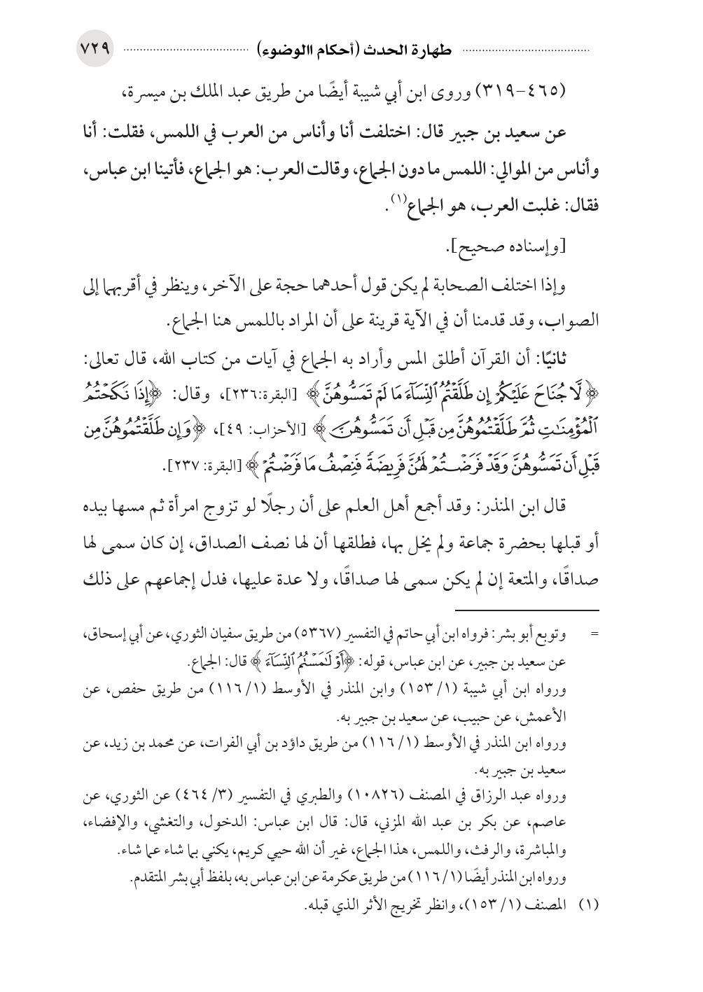 عن سعيد بن جبير قال: اختلفت أنا وأناس من العرب في اللمس، فقلت: أنا وأناس من الموالي: اللمس ما دون الجماع، وقالت العرب: هو الجماع، فأتينا ابن عباس، فقال: غلبت العرب، هو الجماع (¬١).