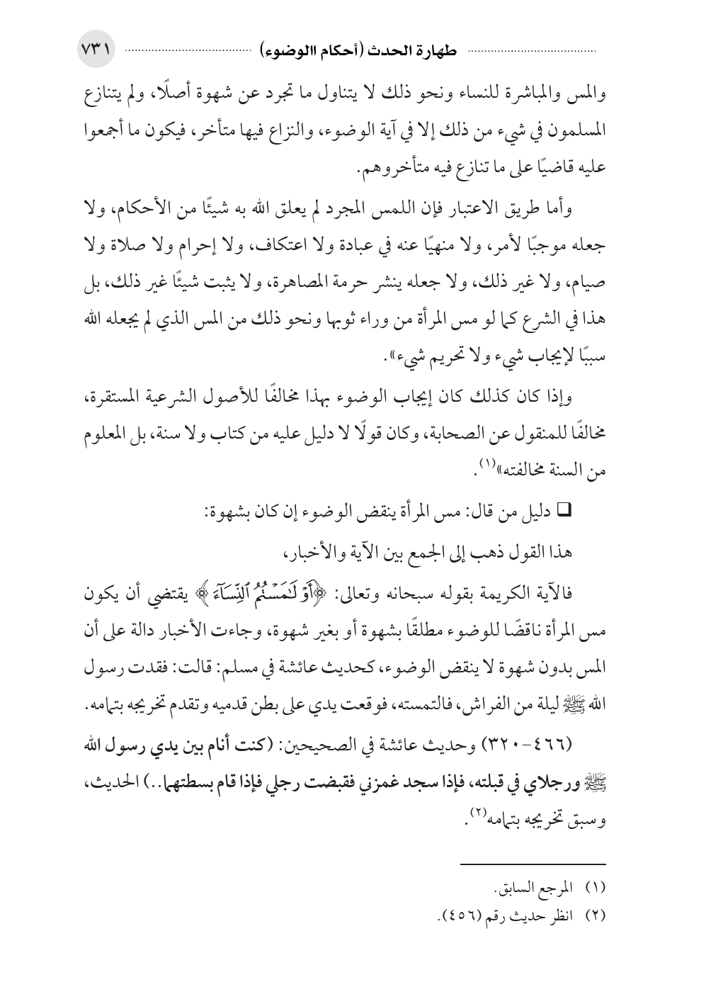 فالآية الكريمة بقوله سبحانه وتعالى: (أَوْ لامَسْتُمُ النِّسَاءَ) يقتضي أن يكون مس المرأة ناقضًا للوضوء مطلقًا بشهوة أو بغير شهوة، وجاءت الأخبار دالة على أن المس بدون شهوة لا ينقض الوضوء، كحديث عائشة في مسلم: قالت: فقدت رسول الله صلى الله عليه وسلم ليلة من الفراش، فالتمسته، فوقعت يدي على بطن قدميه وتقدم تخريجه بتمامه.