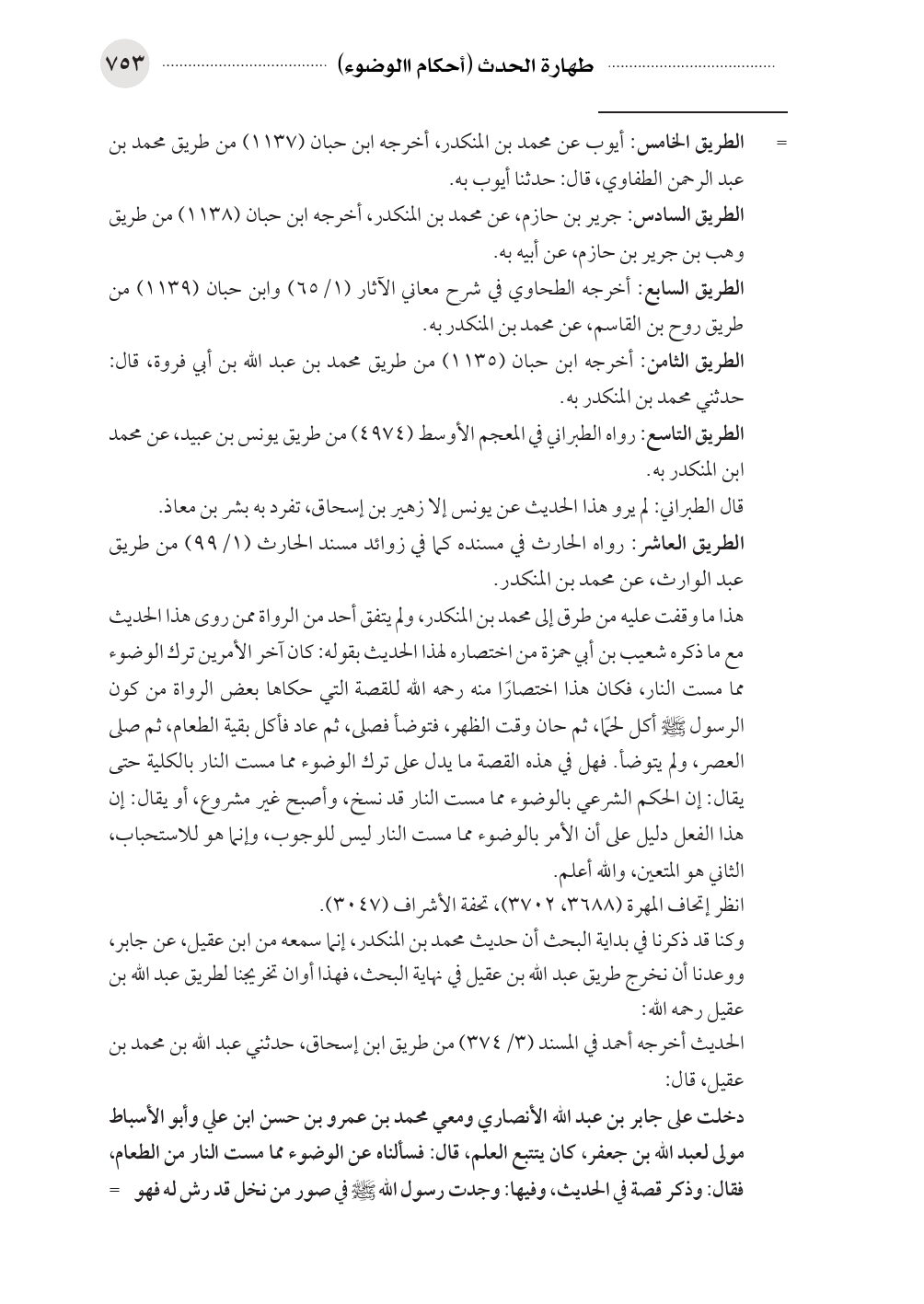 هذا ما وقفت عليه من طرق إلى محمد بن المنكدر، ولم يتفق أحد من الرواة ممن روى هذا الحديث مع ما ذكره شعيب بن أبي حمزة من اختصاره لهذا الحديث بقوله: كان آخر الأمرين ترك الوضوء مما مست النار، فكان هذا اختصارًا منه رحمه الله للقصة التي حكاها بعض الرواة من كون الرسول صلى الله عليه وسلم أكل لحمًا، ثم حان وقت الظهر، فتوضأ فصلى، ثم عاد فأكل بقية الطعام، ثم صلى العصر، ولم يتوضأ. فهل في هذه القصة ما يدل على ترك الوضوء مما مست النار بالكلية حتى يقال: إن الحكم الشرعي بالوضوء مما مست النار قد نسخ، وأصبح غير مشروع، أو يقال: إن هذا الفعل دليل على أن الأمر بالوضوء مما مست النار ليس للوجوب، وإنما هو للاستحباب، الثاني هو المتعين، والله أعلم.