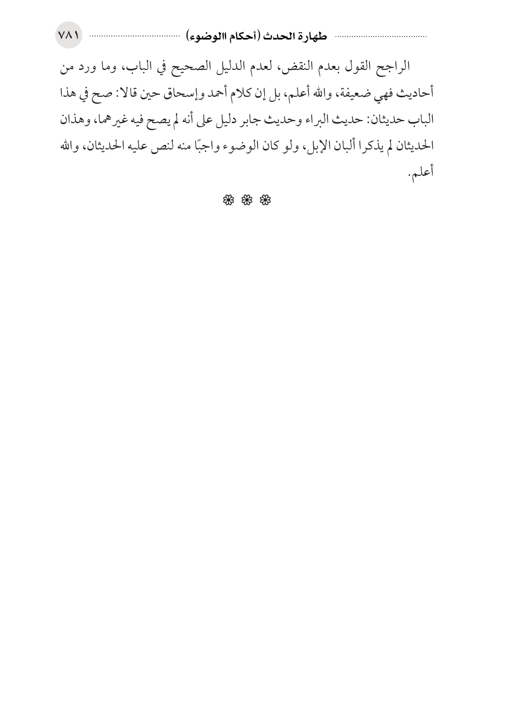الراجح القول بعدم النقض، لعدم الدليل الصحيح في الباب، وما ورد من أحاديث فهي ضعيفة، والله أعلم، بل إن كلام أحمد وإسحاق حين قالا: صح في هذا الباب حديثان: حديث البراء وحديث جابر دليل على أنه لم يصح فيه غيرهما، وهذان الحديثان لم يذكرا ألبان الإبل، ولو كان الوضوء واجبًا منه لنص عليه الحديثان، والله أعلم.