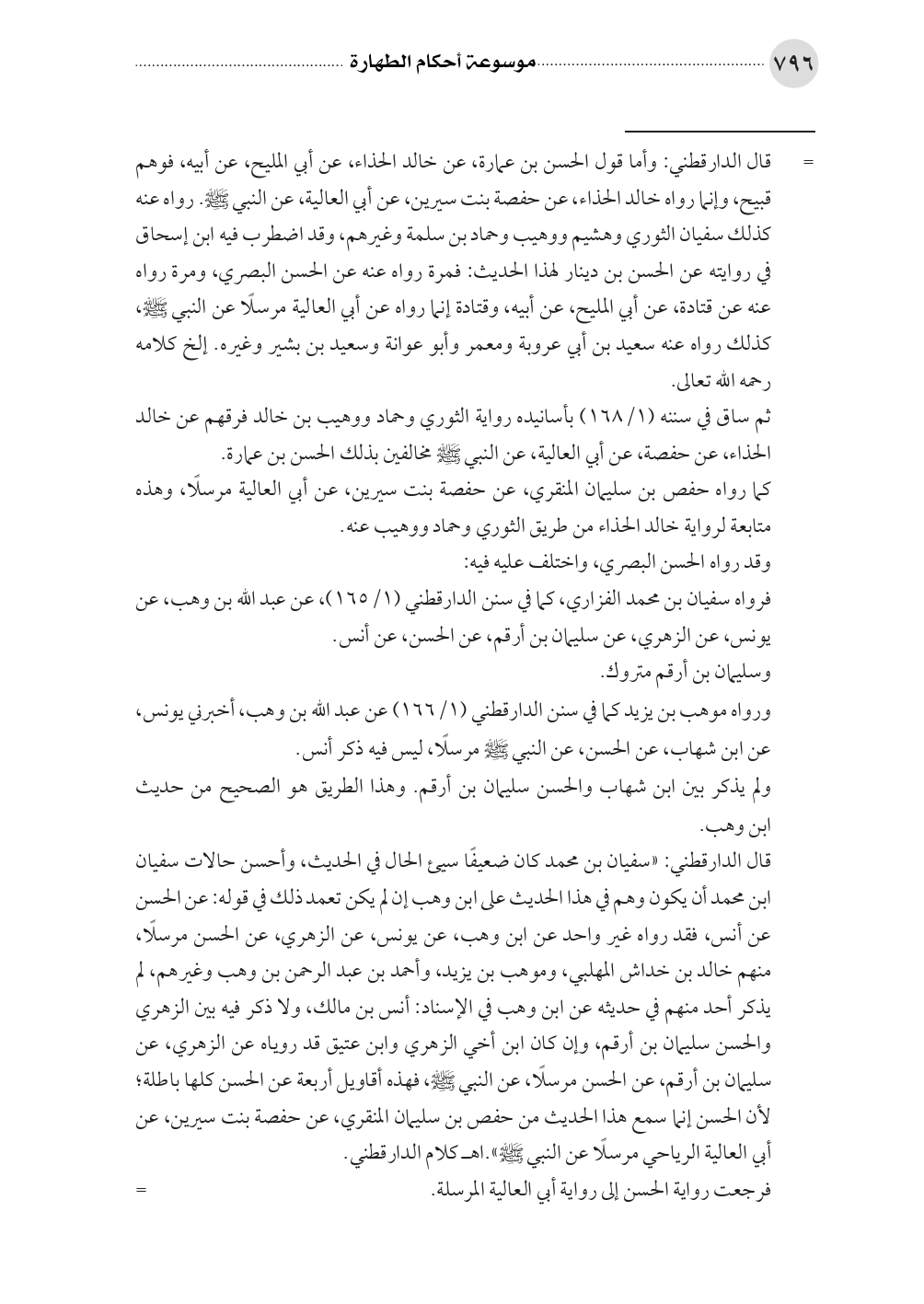 = قال الدارقطني: وأما قول الحسن بن عمارة، عن خالد الحذاء، عن أبي المليح، عن أبيه، فوهم قبيح، وإنما رواه خالد الحذاء، عن حفصة بنت سيرين، عن أبي العالية، عن النبي صلى الله عليه وسلم. رواه عنه كذلك سفيان الثوري وهشيم ووهيب وحماد بن سلمة وغيرهم، وقد اضطرب فيه ابن إسحاق في روايته عن الحسن بن دينار لهذا الحديث: فمرة رواه عنه عن الحسن البصري، ومرة رواه عنه عن قتادة، عن أبي المليح، عن أبيه، وقتادة إنما رواه عن أبي العالية مرسلًا عن النبي صلى الله عليه وسلم، كذلك رواه عنه سعيد بن أبي عروبة ومعمر وأبو عوانة وسعيد بن بشير وغيره. إلخ كلامه رحمه الله تعالى.