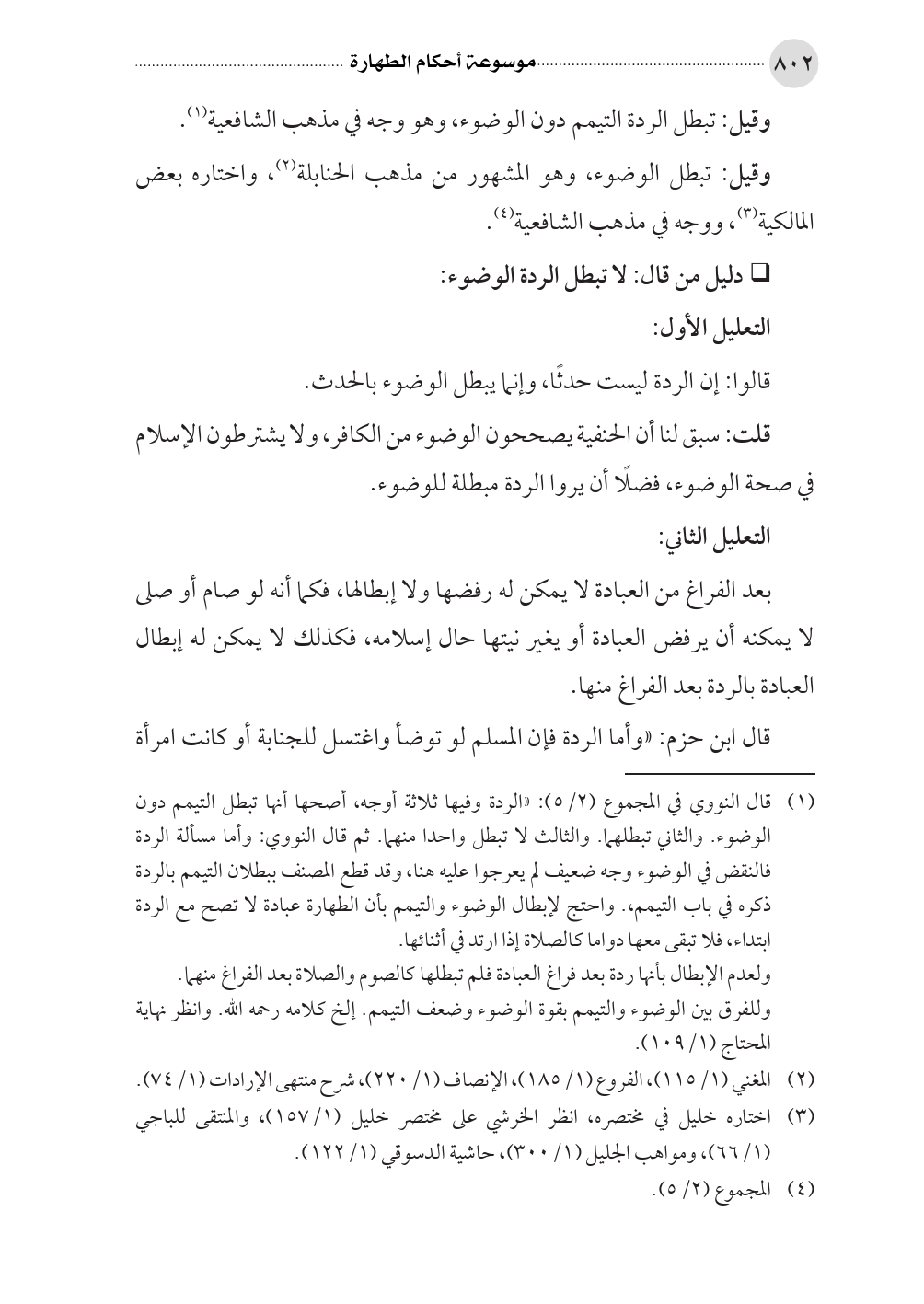 (¬١) قال النووي في المجموع (٢/ ٥): «الردة وفيها ثلاثة أوجه، أصحها أنها تبطل التيمم دون الوضوء. والثاني تبطلهما. والثالث لا تبطل واحدا منهما. ثم قال النووي: وأما مسألة الردة فالنقض في الوضوء وجه ضعيف لم يعرجوا عليه هنا، وقد قطع المصنف ببطلان التيمم بالردة ذكره في باب التيمم،. واحتج لإبطال الوضوء والتيمم بأن الطهارة عبادة لا تصح مع الردة ابتداء، فلا تبقى معها دواما كالصلاة إذا ارتد في أثنائها.