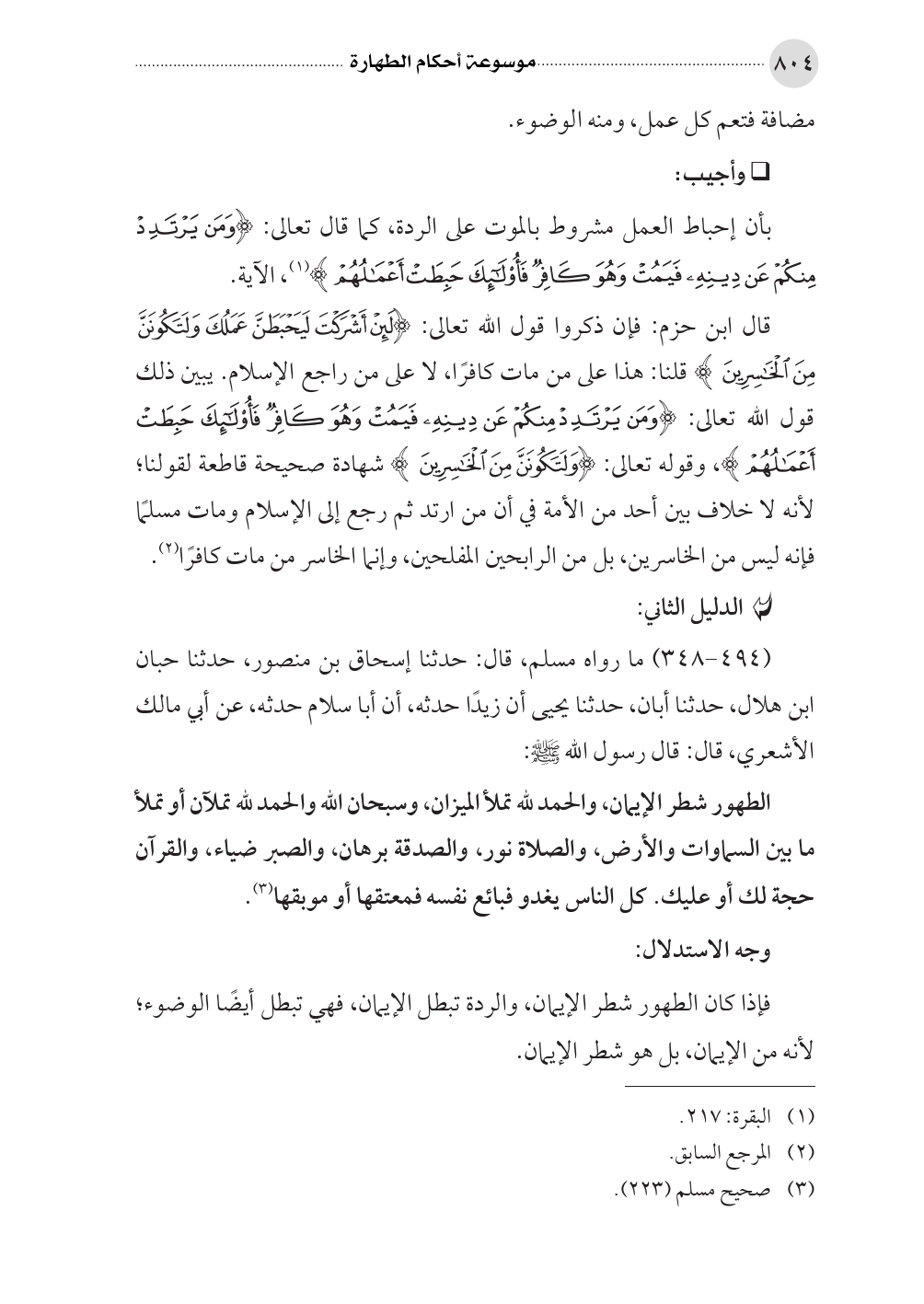 بأن إحباط العمل مشروط بالموت على الردة، كما قال تعالى: (وَمَن يَرْتَدِدْ مِنكُمْ عَن دِينِهِ فَيَمُتْ وَهُوَ كَافِرٌ فَأُوْلَئِكَ حَبِطَتْ أَعْمَالُهُمْ) (¬١)، الآية.