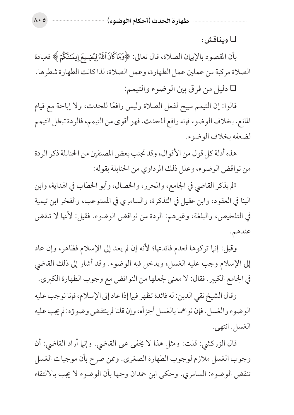 هذه أدلة كل قول من الأقوال، وقد تجنب بعض المصنفين من الحنابلة ذكر الردة من نواقض الوضوء، وعلل ذلك المرداوي من الحنابلة بقوله: