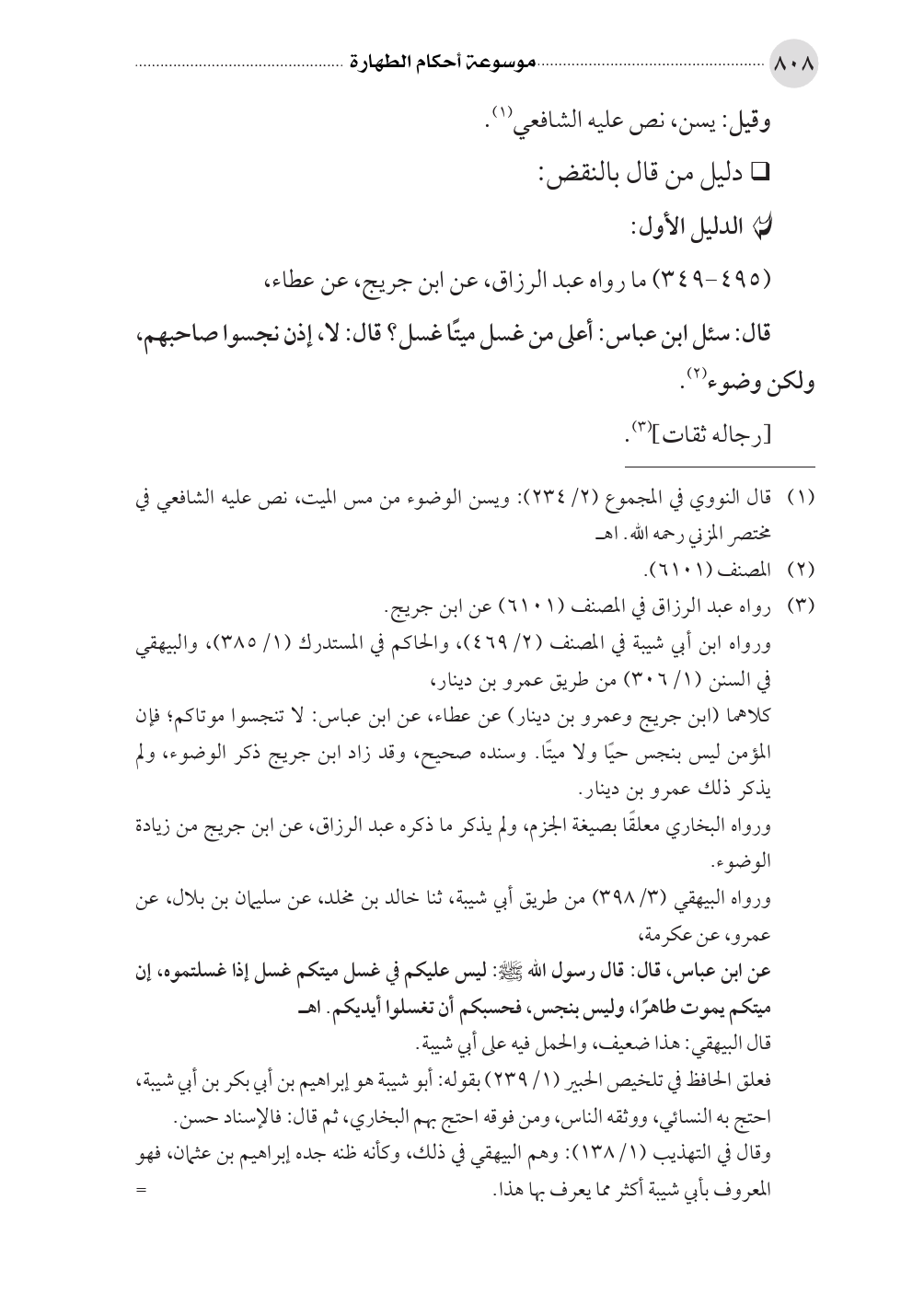 كلاهما (ابن جريج وعمرو بن دينار) عن عطاء، عن ابن عباس: لا تنجسوا موتاكم؛ فإن المؤمن ليس بنجس حيًا ولا ميتًا. وسنده صحيح، وقد زاد ابن جريج ذكر الوضوء، ولم يذكر ذلك عمرو بن دينار.