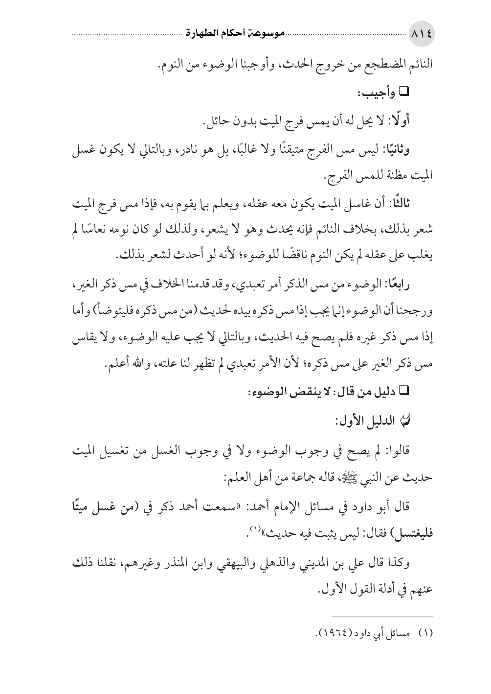 ثالثًا: أن غاسل الميت يكون معه عقله، ويعلم بما يقوم به، فإذا مس فرج الميت شعر بذلك، بخلاف النائم فإنه يحدث وهو لا يشعر، ولذلك لو كان نومه نعاسًا لم يغلب على عقله لم يكن النوم ناقضًا للوضوء؛ لأنه لو أحدث لشعر بذلك.
