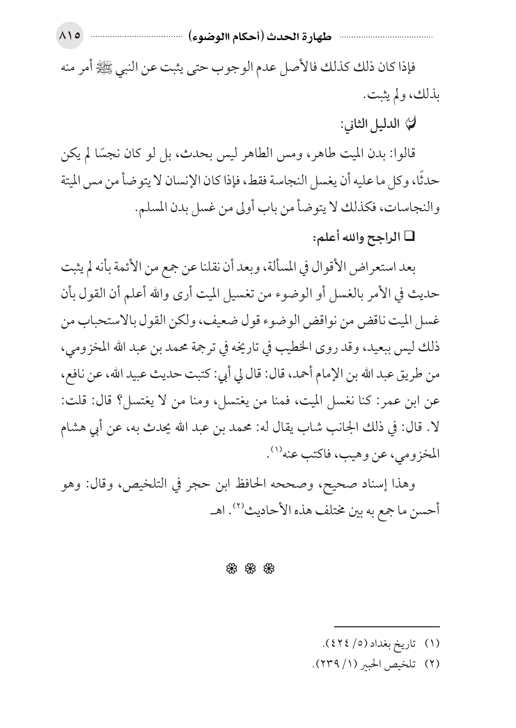 بعد استعراض الأقوال في المسألة، وبعد أن نقلنا عن جمع من الأئمة بأنه لم يثبت حديث في الأمر بالغسل أو الوضوء من تغسيل الميت أرى والله أعلم أن القول بأن غسل الميت ناقض من نواقض الوضوء قول ضعيف، ولكن القول بالاستحباب من ذلك ليس ببعيد، وقد روى الخطيب في تاريخه في ترجمة محمد بن عبد الله المخزومي، من طريق عبد الله بن الإمام أحمد، قال: قال لي أبي: كتبت حديث عبيد الله، عن نافع، عن ابن عمر: كنا نغسل الميت، فمنا من يغتسل، ومنا من لا يغتسل؟ قال: قلت: لا. قال: في ذلك الجانب شاب يقال له: محمد بن عبد الله يحدث به، عن أبي هشام المخزومي، عن وهيب، فاكتب عنه (¬١).