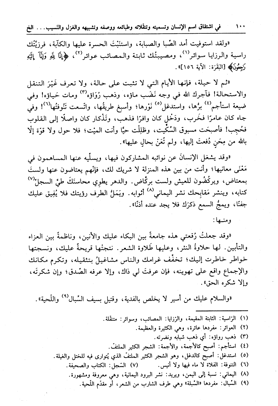 ولقد استوفيت أمد الصبا والصبابة ، واستنبت الحسرة عليها والكآبة . فرزيَّتُك راسية والرزايا سوائر ، ومصيبتك ثابتة والمصائب عوائر . " إنا لله وإنا إليه راجعون " . ثم لا حيلة ، فإنها الأيام التي لا تثبت على حاله ، ولا تعرف غير التنقل والاستحالة فآجرك الله في وجه نضب ماؤه ، وذهب رواؤه ومات حياؤه وفي ضيعة استأجم برُّها ، واستدغل نورها ؛ وأسبع طريقها ، واتسعت تنوفتُها وفي جاه كان عامراً فخرب ، ودخل كان وافراً فذهب ، وتذكار كان واصلاً إلى القلوب فحُجب فأصبحت مسبوق السكِّيت ، وظللت حياً وأنت الميت ؛ فلا حول ولا قوة إلا بالله من محنٍ دُفعت إليها ، ولم تُعن بحال عليها .
