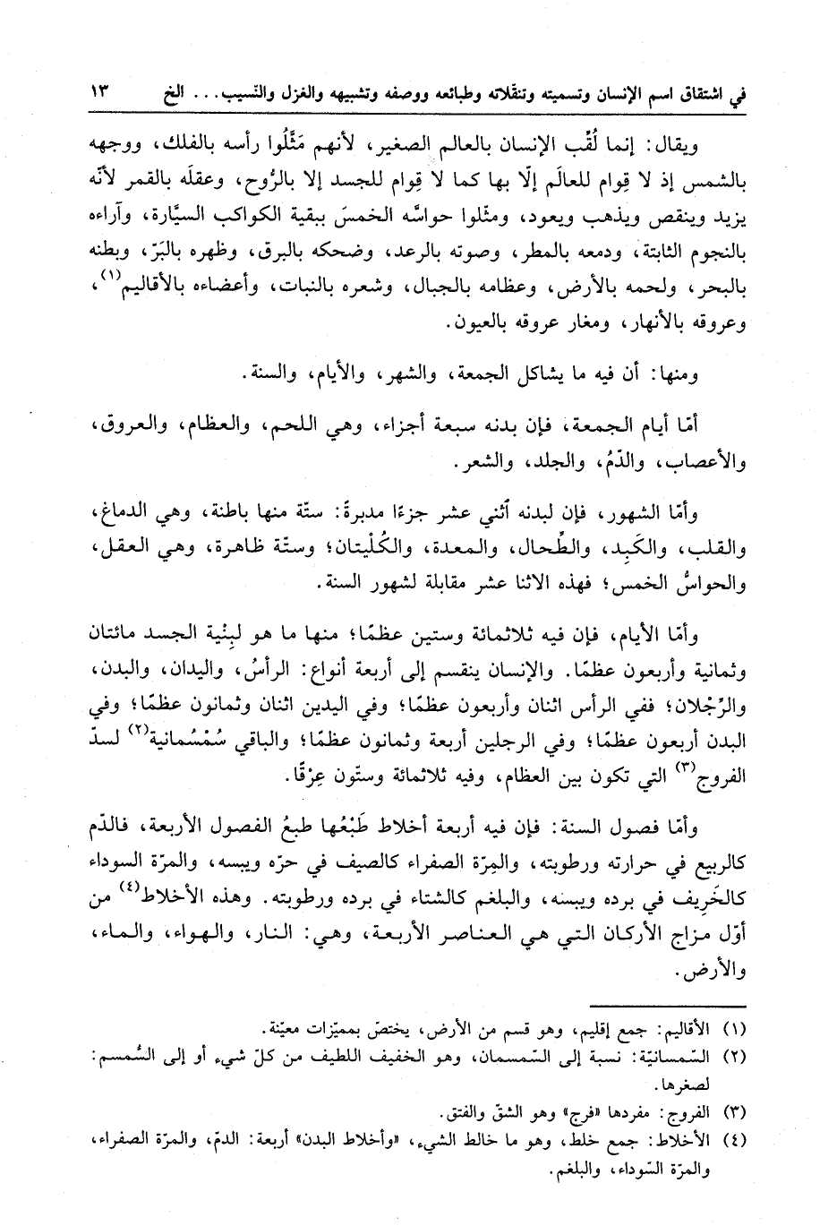 وأما الأيام ، فإن فيه ثلاثمائة وستين عظما ؛ منها ما هو لبنية الجسد مائتان وثمانية وأربعون عظما . والإنسان ينقسم إلى أربعة أنواع : الرأس ، واليدان ، والبدن ، والرجلان ، ففي الرأس اثنتان وأربعون عظما ؛ وفي اليدين اثنان وثمانون عظما ؛ وفي البدن أربعون عظما ؛ وفي الرجلين أربعة وثمانون عظما ؛ والباقي سُمْسُمانية لسدّ الفروج التي تكون بين العظام . وفيه ثلاثمائة وستون عِرْقا . وأما فصول السنة : فإن فيه أربعة أخلاط طبْعُها طبعُ الفصول الأربعة ، فالدّم كالربيع في حرارته ورطوبته ، والمِرّة الصفراء كالصيف في حرّه ويبسه ، والمرّة السوداء كالخريف في برده ويبسه ، والبلغم كالشتاء في برده ورطوبته . وهذه الأخلاط من أوّل مزاج الأركان التي هي العناصر الأربعة ، وهي : النار ، والهواء ، والماء ، والأرض .