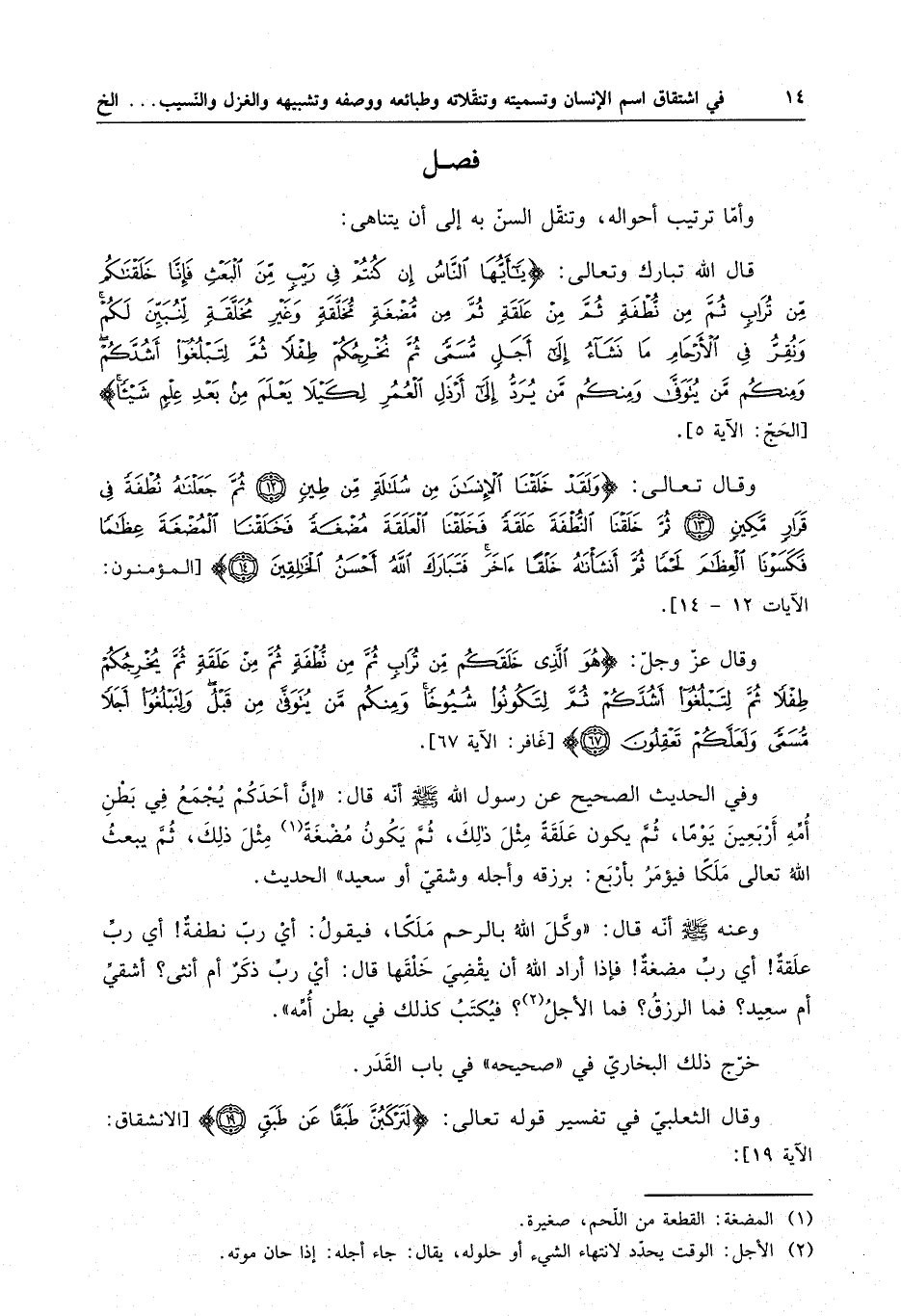 وقال تعالى : " ولقدْ خلقْنا الإنْسانَ مِنْ سُلالةٍ مِن طينٍ ثُمَّ جَعلْناهُ نُطْفةً في قرارٍ مَكِينٍ ثُمَّ خلقْنا النُّطْفة علقةً فخلقْنا الْعلقة مُضْغةً فخلقْنا الْمُضغة عظاماً فكسوْنا العظام لحمْاً ثُمَّ أنْشأْناهُ خلْقاً آخر فتبارك الله أحْسنُ الْخالقين " .