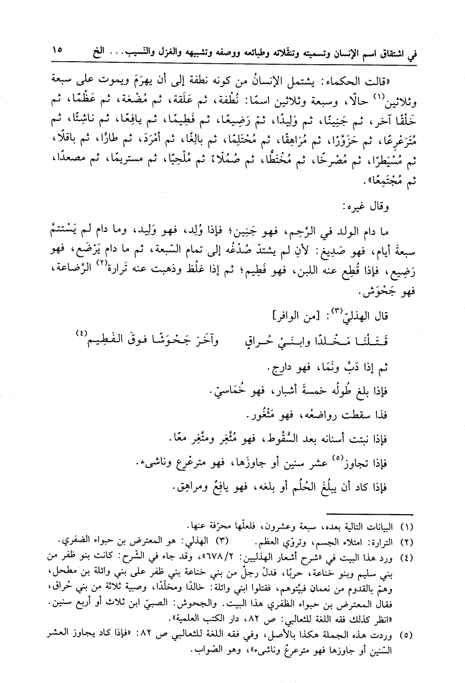 " قالت الحكماء : يشتمل الإنسان من كونه نطفة إلى أن يهرم ويموت على سبعة وثلاثين حالا ، وسبعة وثلاثين اسما : نُطْفة ، ثم علقة ، ثم مُضغة ، ثم عظماً ، ثم خلقاً آخر ، ثم جنينا ، ثم وليداً ، ثم رضيعاً ، ثم فطيماً ، ثم يافعاً ، ثم ناشئاً ، ثم مترعرعاً ، ثم حزوَّراً ، ثم مُراهقاً ، ثم مُحْتلماً ، ثم بالغاً ، ثم أمرد ، ثم طارّاً ، ثم باقلاً ، ثم مُسيطراً ، ثم مُصْرخاً ، ثم مُخْتطاً ، ثم صُمُلاً ، ثم مُلحياً ، ثم مستريماً ، ثم مصعداً ، ثم مُجْتمعاً .