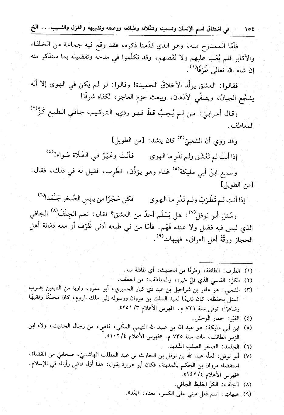 وسئل أبو نوفل : هل يسلم أحدٌ من العشق ؟ فقال : نعم الجلف الجافي الذي ليس فيه فضل ولا عنده فهم . فأما من في طبعه أدنى ظرف أو معه دماثة أهل الحجاز ورقَّة أهل العراق ، فهيهات