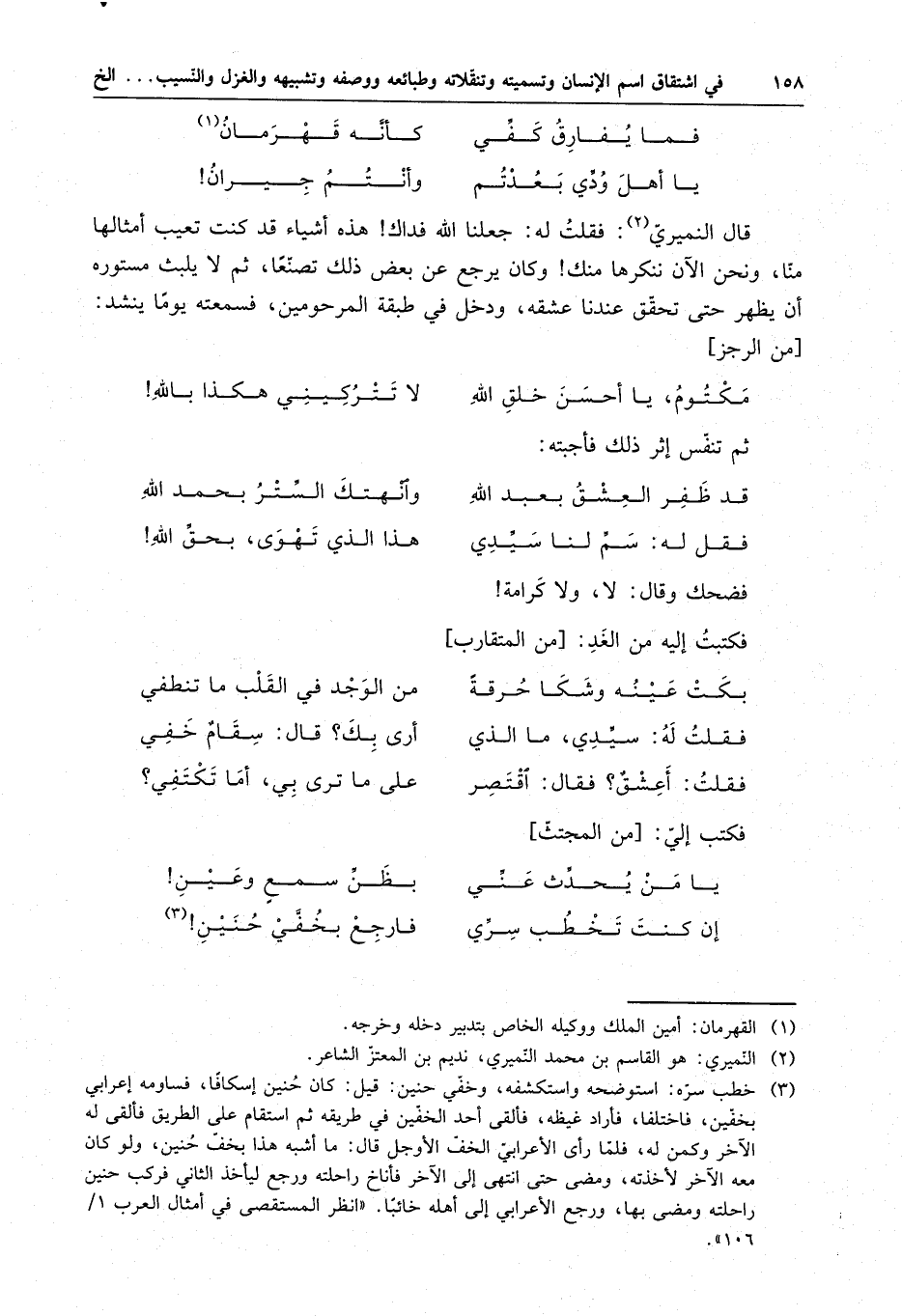 قال النميريّ : فقلت له : جعلنا الله فداك هذه أشياء قد كنت تعيب أمثالها منا ، ونحن الآن ننكرها منك وكان يرجع عن بعض ذلك تصنعاً ، ثم لا يلبث مستوره أن يظهر حتى تحقق عندنا عشقه ، ودخل في طبقة المرحومين ، فسمعته يوماً ينشد :