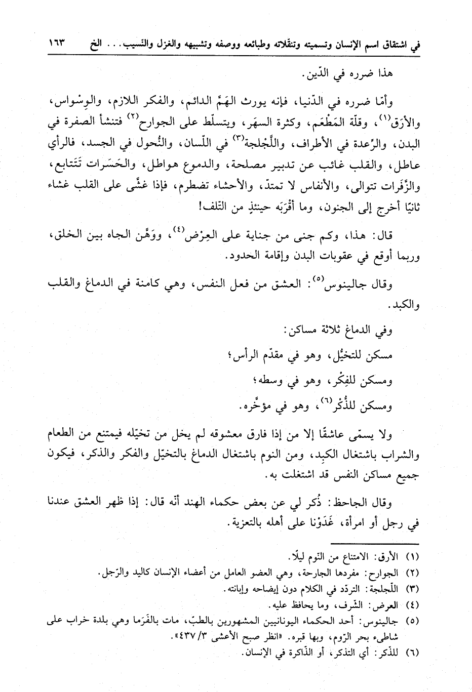 وقال جالينوس : العشق من فعل النفس ، وهي كامنة في الدماغ والقلب والكبد .