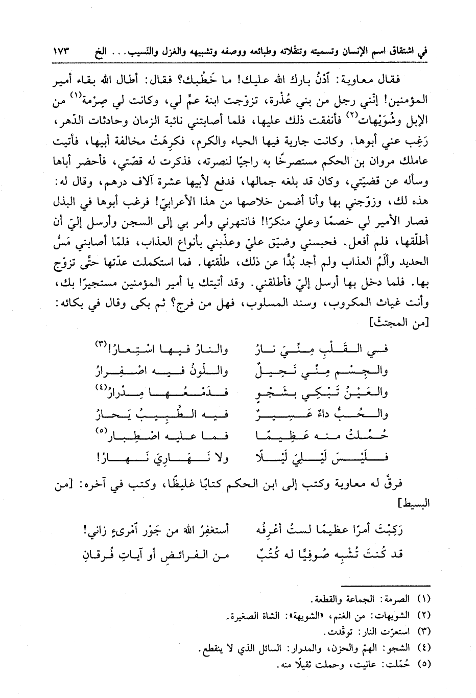 فقال معاوية : ادن بارك الله عليك ما خطبك ؟ فقال : أطال الله بقاء أمير المؤمنين إنني رجل من بني عذرة ، تزوجت ابنة عمّ لي . وكانت لي صرمةٌ من الإبل وشويهات فأنفقت ذلك عليها ، فلما أصابتني نائبة الزمان وحادثات الدهر ، رغب عني أبوها . وكانت جارية فيها الحياء والكرم ، فكرهت مخالفة أبيها . فأتيت عاملك مروان بن الحكم مستصرخاً به راجياً لنصرته . فذكرت له قصتي ، فأحضر أباها وسأله عن قضيتي . وكان قد بلغه جمالها ، فدفع لأبيها عشرة آلاف درهم ، وقال له : هذه لك ، وزوّجني بها وأنا أضمن خلاصها من هذا الأعرابيّ فرغب أبوها في البذل فصار الأمير لي خصماً وعليّ منكرا فانتهرني وأمر بي إلى السجن وأرسل إليّ أن أطلقها فلم أفعل . فحبسني وضيق عليّ وعذبني بأنواع العذاب ، فلما أصابني مسُّ الحديد وألم العذاب ولم أجد بدّاً عن ذلك ، طلقتها . فما استكملت عدّتها حتّى تزوج بها . فلما دخل بها أرسل إليّ فأطلقني . وقد أتيتك يا أمير المؤمنين مستجيراً بك ، وأنت غياث المكروب ، وسند المسلوب . فهل من فرج ؟ وبكى وقال في بكائه :