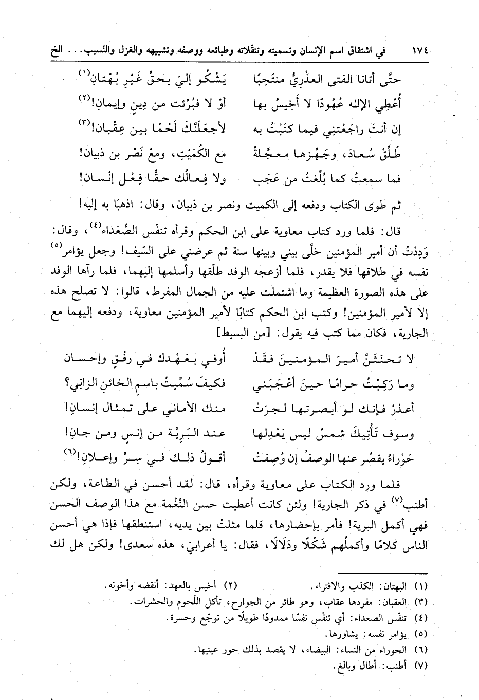 فلما ورد الكتاب على معاوية وقرأه ، قال : لقد أحسن في الطاعة ، ولكن أطنب في ذكر الجارية ولئن كانت أعطيت حسن النَّغمة مع هذا الوصف الحسن فهي أكمل البرية فأمر بإحضارها ، فلما مثلت بين يديه ، استنطقها فإذا هي أحسن الناس كلاماً وأكملهم شكلاً ودلالاً . فقال : يا أعرابيّ ، هذه سعدي ولكن هل لك