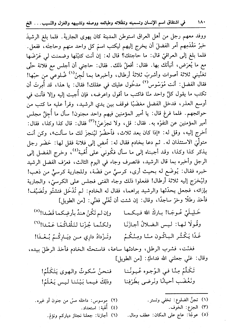 ووفد معهم رجل من أهل العراق استوطن المدينة كان يهوى الجارية . فلما بلغ الرشيد خبر مقدمهم أمر الفضل أن يخرج إليهم ليكتب اسم كل واحد منهم وحاجته ، ففعل . فلما بلغ إلى العراقيّ قال : ما حاجتك ؟ قال له : إن أنت كتبتها وضمنت لي عرضها مع ما يعرض ، أنبأتك بها . فقال : أفعل ذلك ، فقال : حاجتي أن أجلس مع فلانة حتى تغنِّيني ثلاثة أصوات وأشرب ثلاثة أرطال ، وأخبرها بما تُجنّ ضلوعي من حبها فقال الفضل : أنت موسوس مدخول عليك في عقلك فقال : يا هذا ، قد أُمرت أن تكتب ما يقول كلُّ واحد منا فاكتب ما أقول واعرضه ، فإن أُجبت إليه وإلا فأنت في أوسع العذر ، فدخل الفضل مغضباً فوقف بين يدي الرشيد ، وقرأ عليه ما كتب من حوائجهم . فلما فرغ قال : يا أمير المؤمنين فيهم واحد مجنون سأل ما أُجلُّ مجلس أمير المؤمنين عن التفوّه به . فقال : قل ، ولا تجزعنّ فقال : قال كذا وكذا . فقال : اخرج إليه ، وقل له إذا كان بعد ثلاث ، فاحضر لينجز لك ما سألت . وكن أنت متولِّي الاستئذان له . ثم دعا بخادم فقال له : امض إلى فلانة فقل لها : حضر رجل يذكر كذا وكذا وقد أجبناه إلى ما سأل فكوني على أهبة . وخرج الفضل إلى الرجل وأخبره بما قال الرشيد ، فانصرف وجاء في اليوم الثالث . فعرّف الفضل الرشيد خبره فقال : يوضع له بحيث أرى كرسيٌّ من فضة ، وللجارية كرسيٌّ من ذهب وليخرج إليه ثلاثة أرطال ففعلوا ذلك وجاء الفتى فجلس على الكرسيّ ، والجارية بإزائه ، فجعل يحدّثها والرشيد يراهما ، فقال له الخادم : لم تدخل فتشتو وتصيِّف فأخذ رطلاً وخرّ ساجداً ، قال : إن شئت أن تغنِّي فغنِّي :