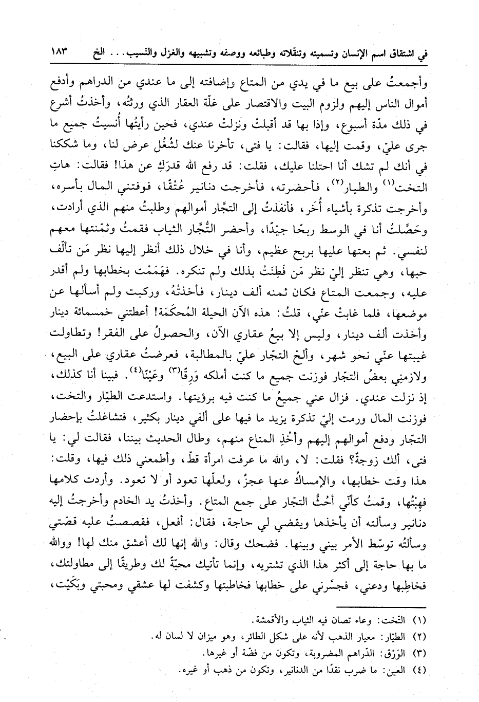 وأجمعت على بيع ما في يدي من المتاع وإضافته إلى ما عندي من الراهم وأدفع أموال الناس إليهم ولزوم البيت والاقتصار على غلة العقار الذي ورثته . وأخذت أشرع في ذلك مدة أسبوع ، وإذا بها قد أقبلت ونزلت عندي ، فحين رأيتها أُنسيت جميع ما جرى عليّ ، وقمت إليها . فقالت : يا فتى ، تأخرنا عنك لشغل عرض لنا ، وما شككنا في أنك لم تشك أنا احتلنا عليك ، فقلت : قد رفع الله قدرك عن هذا فقالت ، هات التخت والطيار ، فأحضرته ، فأخرجت دنانير عتقاً ، فوفتني المال بأسره . وأخرجت تذكرة بأشياء أُخر . فأنفذت إلى التجَّار أموالهم وطلبت منهم الذي أرادت ، وحصلت أنا في الوسط ربحاً جيداً . وأحضر التُجَّار الثياب فقمت وثمنتها معهم لنفسي . ثم بعتها عليها بربح عظيم ، وأنا في خلال ذلك أنظر إليها نظر من تألف حبها ، وهي تنظر إليّ نظر من فطنت بذلك ولم تنكره . فهممت بخطابها ولم أقدر عليه . وجمعت المتاع فكان ثمنه ألف دينار . فأخذته ، وركبت ولم أسألها عن موضعها . فلما غابت عني ، قلت : هذه الآن الحيلة المحكمة أعطتني خمسمائة دينار وأخذت ألف دينار ، وليس إلا بيع عقاري الآن ، والحصول على الفقر وتطاولت غيبتها عني نحو شهر . وألّح التجار عليّ بالمطالبة ، فعرضت عقاري على البيع ، ولازمني بعض التجار فوزنت جميع ما كنت أملكه ورقاً وعيناً . فبينما أنا كذلك ، إذ نزلت عندي . فزال عني جميع ما كنت فيه برؤيتها . واستدعيت الطيار والتخت ، فوزنت المال ورمت إليّ تذكرة يزيد ما فيها على ألفي دينار بكثير . فتشاغلت بإحضار التجار ودفع أموالهم إليهم وأخذ المتاع منهم ، وطال الحديث بيننا . فقالت لي : يا فتى ، ألك زوجةٌ ؟ فقلت : لا ، والله ما عرفت امرأة قط ، وأطمعني ذلك فيها ، وقلت : هذا وقد خطابها ، والإمساك عنها عجزٌ ، ولعلها تعود أو لا تعود . وأردت كلامها فهبتُها . وقمت كأني أحُثُّ التجار على جمع المتاع . وأخذت يد الخادم وأخرجت إليه دنانير وسألته أن يأخذها ويقضي لي حاجة . فقال : أفعل ، فقصصت عليه قصتي وسألته توسط الأمر بيني وبينها . فضحك وقال : والله إنها لك أعشق منك لها ووالله ما بها إلى أكثر هذا الذي تشتريه ، وإنما تأتيك محبةً لك وطريقاً إلى مطاولتك ، فخاطبها ودعني ، فجسَّرني على خطابها فخاطبتها وكشفت لها عشقي ومحبتي وبكيت ،
