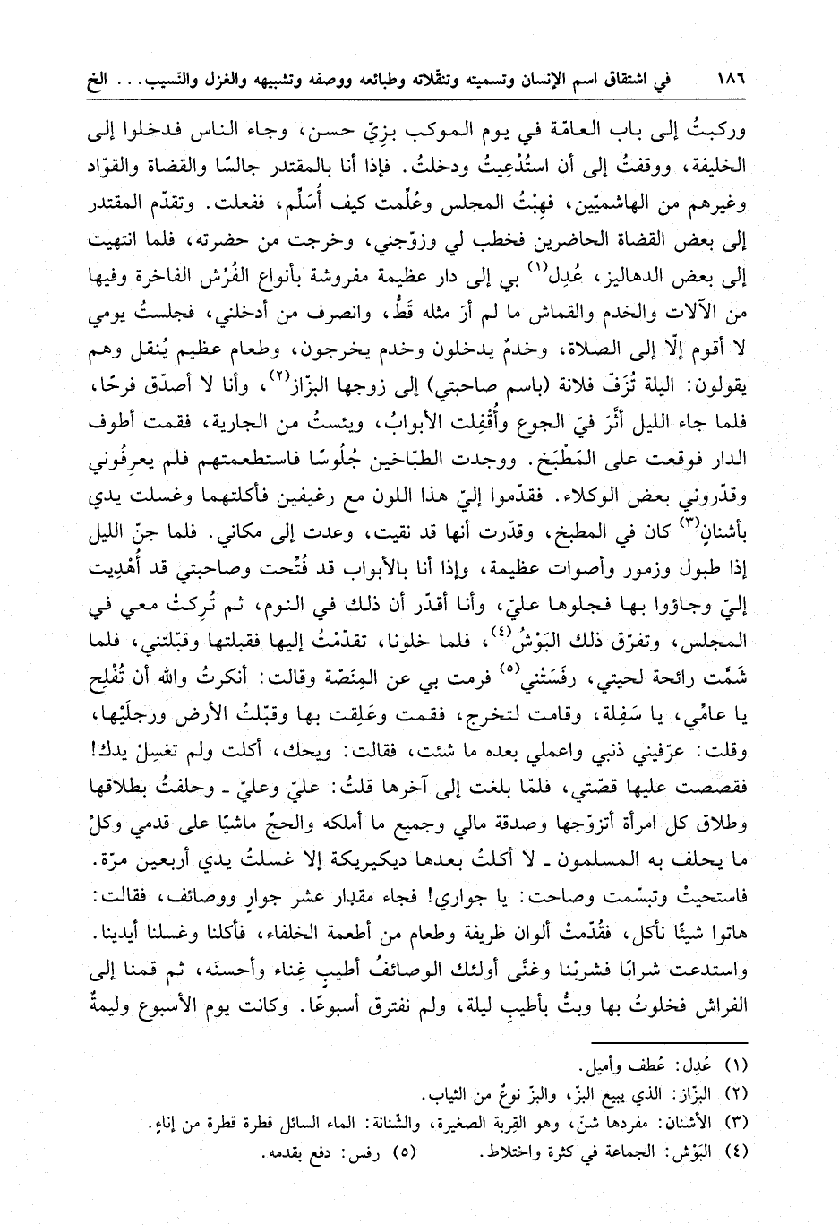 وركبت إلى باب العامة في يوم الموكب بزيّ حسن . وجاء الناس فدخلوا إلى الخليفة ، ووقفت إلى أن استدعيت ودخلت . فإذا أنا بالمقتدر جالساً والقضاة والقوّاد وغيرهم من الهاشميين . فهبت المجلس وعُلِّمت كيف أُسلِّم . ففعلت . وتقدّم المقتدر إلى بعض القضاة الحاضرين فخطب لي وزوّجني . وخرجت من حضرته . فلما انتهيت إلى بعض الدهاليز ، عُدل بي إلى دار عظيمة مفروشة بأنواع الفرش الفاخرة وفيها من الآلات والخدم والقماش ما لم أر مثله قطُّ . وانصرف من أدخلني . فجلست يومي لا أقوم إلا إلى الصلاة . وخدمٌ يدخلون وخدم يخرجون ، وطعام عظيم ينقل وهم يقولون : الليلة تُزف فلانة باسم صاحبتي إلى زوجها البزّاز ، وأنا لا أصدق فرحاً . فلما جاء الليل أثَّر فيّ الجوع وأُقفلت الأبواب ، ويئست من الجارية ، فقمت أطوف الدار فوقعت على المطبخ . ووجدت الطباخين جلوساً فاستطعمتهم فلم يعرفوني وقدّروني بعض الوكلاء . فقدموا إليّ هذا اللون مع رغيفين فأكلتهما وغسلت يدي بأشنان كان في المطبخ وقدّرت أنها قد نقيت . وعدت إلى مكاني . فلما جنّ الليل إذا طبول وزمور وأصوات عظيمة ، وإذا أنا بالأبواب قد فُتِّحت وصاحبتي قد أُهديت إليّ وجاءوا بها فجلوها عليّ ، وأنا أقدّر أن ذلك في النوم . ثم تركت معي في المجلس . وتفرّق ذلك البوش . فلما خلونا ، تقدمت إليها فقبلتها وقبلتني . فلما شمَّت رائحة لحيتي ، رفستني فرمت بي عن المنصة وقالت : أنكرت والله أن تفلح يا عاميِّ ، يا سفلة ، وقامت لتخرج ، فقمت وعلقت بها وقبلت الأرض ورجليها ، وقلت : عرفيني ذنبي واعملي بعده ما شئت ، فقالت : ويحك ، أكلت ولم تغسل يدك فقصصت عليها قصتي ، فلما بلغت إلى آخرها قلت : عليّ وعليّ - وحلفت بطلاقها وطلاق كل امرأة أتزوّجها وصدقة مالي وجميع ما أملكه والحجِّ ماشياً على قدميّ وكلِّ ما يحلف به المسلمون لا أكلت بعدها ديكيريكة إلا غسلت يدي أربعين مرة . فاستحيت وتبسمت وصاحت : يا جواري فجاء مقدار عشر جوار ووصائف ، فقالت : هاتوا شيئاً نأكل ، فقدّمت ألوان ظريفة وطعام من أطعمة الخلفاء . فأكلنا وغسلنا أيدينا . واستدعت شراباً فشربنا وغنَّى أولئك الوصائف أطيب غناء وأحسنه ، ثم قمنا إلى الفراش فخلوت بها وبتُّ بأطيب ليلة ، ولم نفترق أسبوعاً . وكانت يوم الأسبوع وليمةٌ