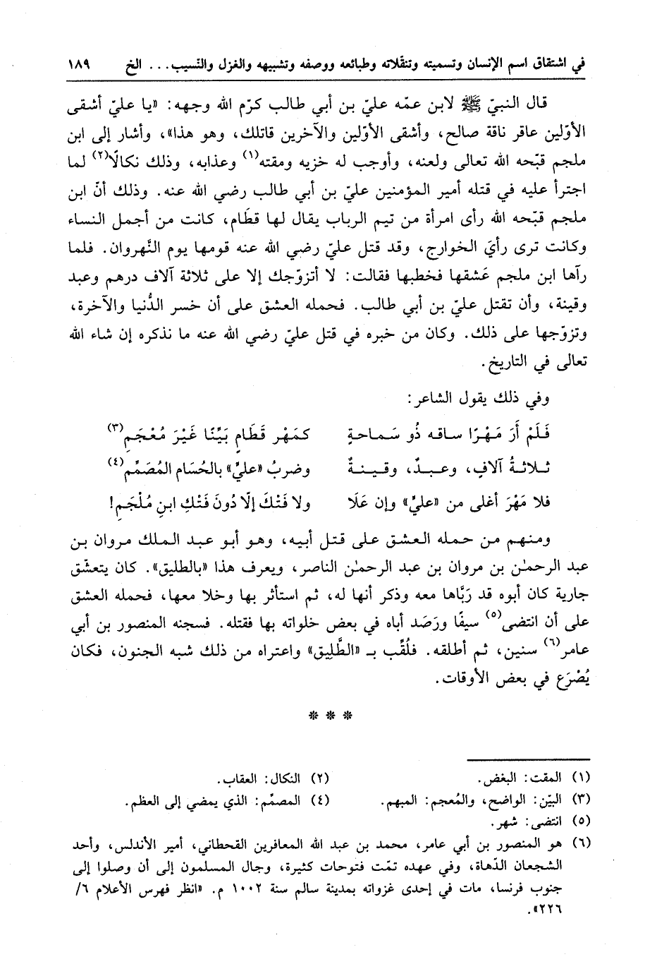 قال النبي ( صلى الله عليه وسلم ) لابن عمه عليّ بن أبي طالب كرم الله وجهه : يا عليّ أشقى الأوّلين عاقر ناقة صالح ، وأشقى الأوّلين والآخرين قاتلك ، وهو هذا وأشار إلى ابن ملجم قبحه الله تعالى ولعنه ، وأوجب له خزيه ومقته وعذابه ، وذلك نكالاً لما اجترأ عليه في قتله أمير المؤمنين عليّ بن أبي طالب رضي الله عنه . وذلك أن ابن ملجم قبحه الله رأى امرأة من تيم الرباب يقال لها قطام ، كانت من أجمل النساء وكانت ترى رأى الخوارج ، وقد قتل عليّ رضي الله عنه قومها يوم النَّهروان . فلما رآها ابن ملجم عشقها فخطبها فقالت : لا أتزوجك إلا على ثلاثة آلاف درهم وعبد وقينة ، وأن تقتل عليّ بن أبي طالب . فحمله العشق على أن خسر الدنيا والآخرة ، وتزوجها على ذلك . وكان من خبره في قتل عليّ رضي الله عنه ما نذكره إن شاء الله تعالى في التاريخ .